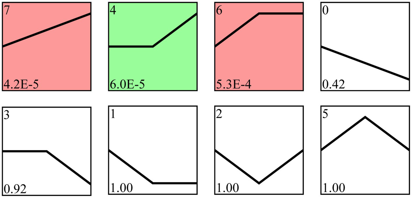 Trend analysis of A. apis milRNAs. Colorful squares represent significant trends, while colorless squares represent non-significant trends; the numbers located in the upper left of each square indicate different trends, whereas those located in the lower left of each square indicate the p value of each trend.