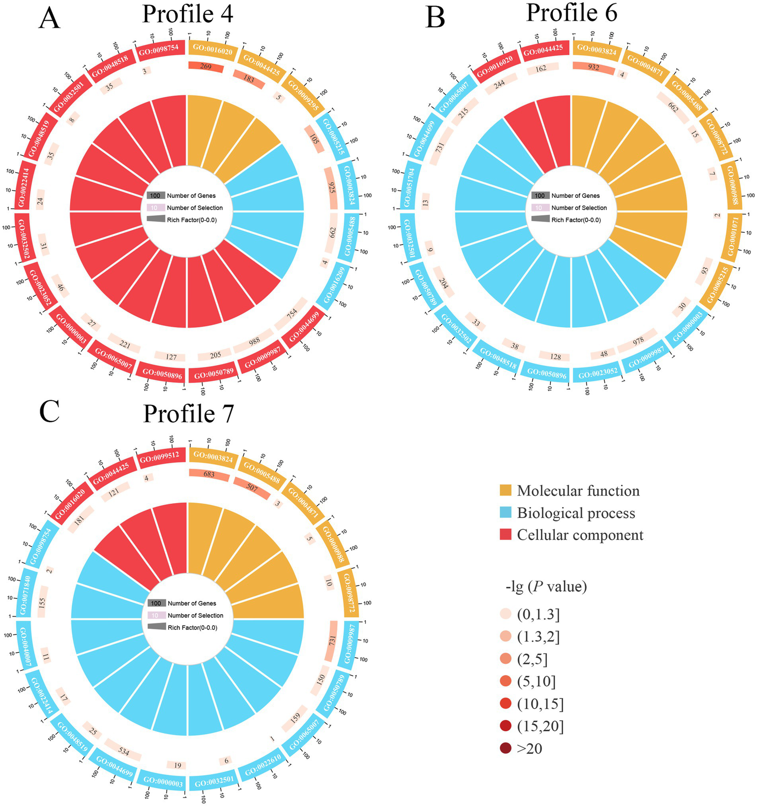 Loop diagrams of GO terms enriched by target mRNAs of A. apis milRNAs within 3 significant trends including profile4 (A), profile6 (B), and profile7 (C).