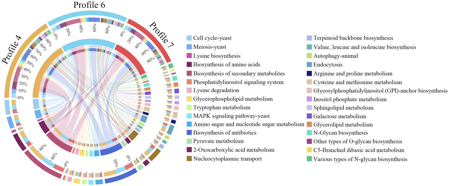 In contrast to GO annotation, KEGG enrichment focused on pathway-level interactions and regulation of genes in biological systems. Here, 120 KEGG pathways were enriched by 4,457 target mRNAs of DEmilRNAs in profile 4, such as lysine biosynthesis, phosphatidylinositol signaling system, and pyruvate metabolism (Figure 6, see also Supplementary Table S5), 4,469 target mRNAs of DEmilRNAs in profile 6 were involved in 119 pathways like glycosylphosphatidylinositol (GPI)-anchor biosynthesis, galactose metabolism, and endocytosis (Figure 6, see also Supplementary Table S6), whereas 3,275 target mRNAs of DEmilRNAs in profile7 were relevant to 118 pathways including biosynthesis of antibiotics, tryptophan metabolism, and sphingolipid metabolism (Figure 6, see also Supplementary Table S7).