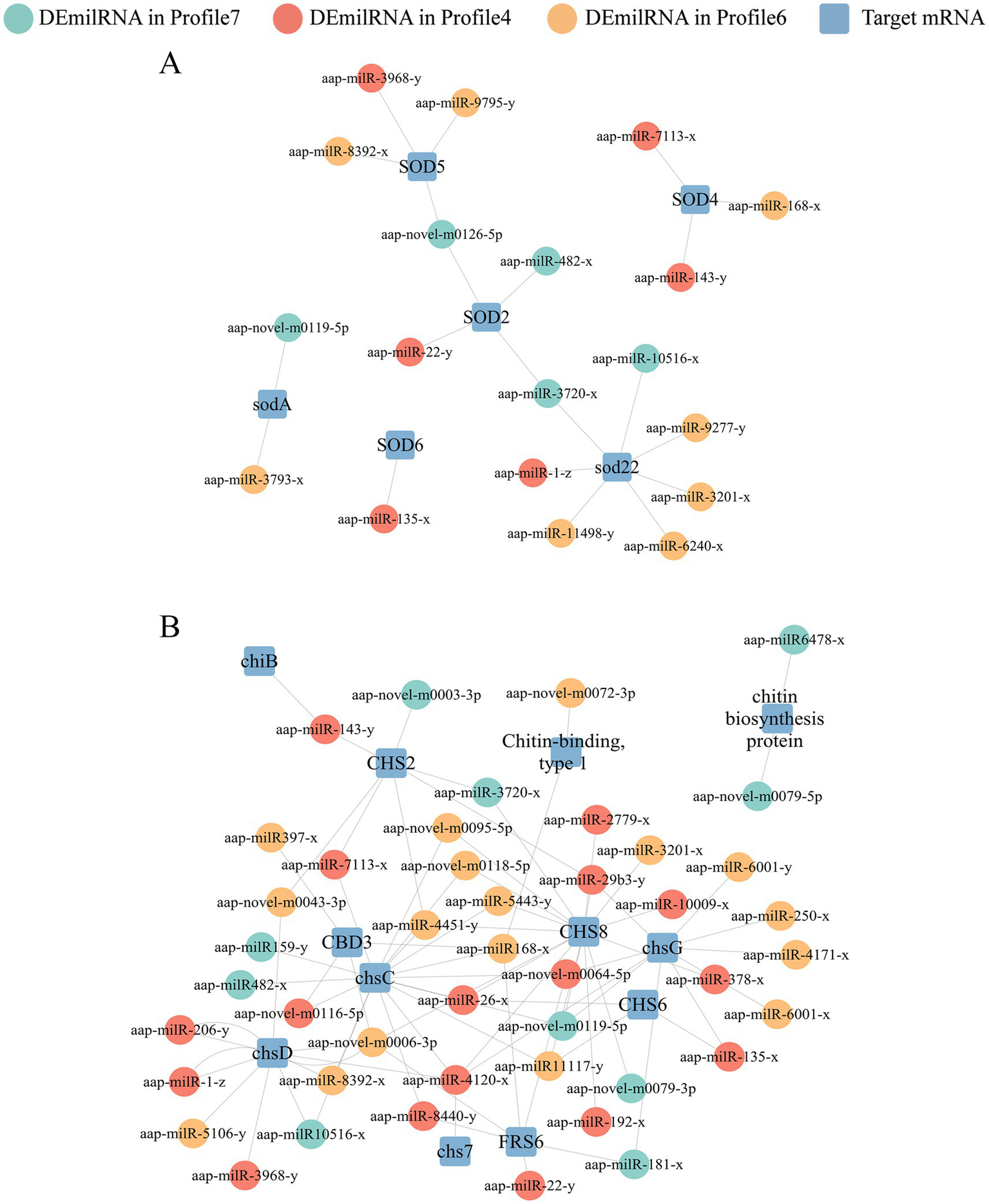 Regulatory networks between A. apis DEmilRNAs in significant trends and target mRNAs associated with virulence factors. (A) Regulatory network of milRNAs-targeted superoxide dismutase-encoding mRNAs; (B) Regulatory network of milRNAs-targeted enzymes related to chitin synthesis and degradation-encoding mRNAs.