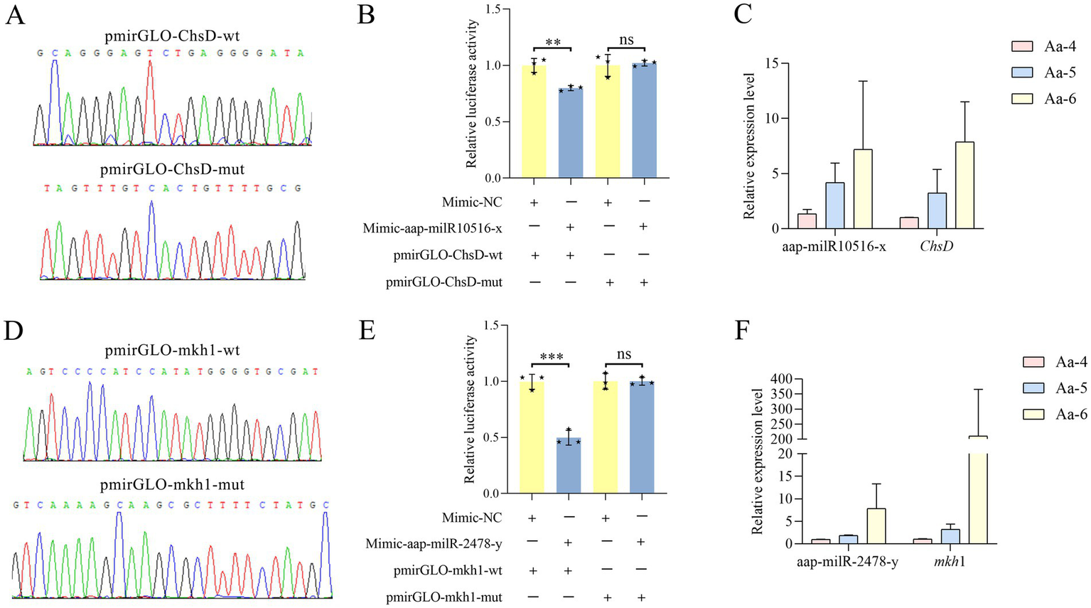 Validation of binding relationships between ChsD and aap-milR10516-x and between mkh1 and aap-milR-2478-y. (A) Peak diagram of Sanger sequencing of the amplified binding sites. (B) Dual-luciferase reporter gene assay of the binding relationship between aap-milR10516-x and ChsD. (C) RT-qPCR detection of aap-milR10516-x and ChsD. (D) Peak diagram of Sanger sequencing of the mutated binding sites. (E) Dual-luciferase reporter gene assay binding relationship between aap-milR-2478-y and mkh1. (F) RT-qPCR detection of aap-milR-2478-y and mkh1. The dual-luciferase assay data were presented as mean ± standard deviation (SD) and analyzed by two-sided Student’s t-test; ns, p > 0.05; **p < 0.01; ***p < 0.001.