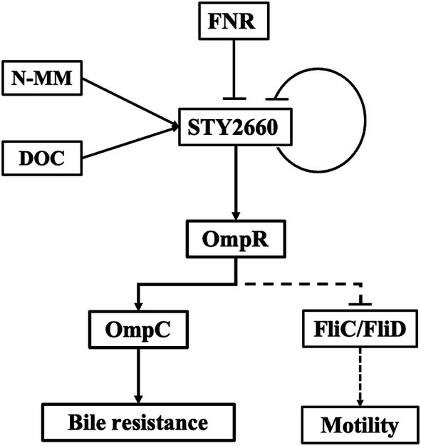 The FNR-STY2660-OmpR-OmpC-FliC/FliD regulatory network. FNR and STY2660 negatively regulate STY2660 expression. The N-MM and DOC positively regulate STY2660 expression for OmpR induction for porin synthesis-bile resistance and motility.