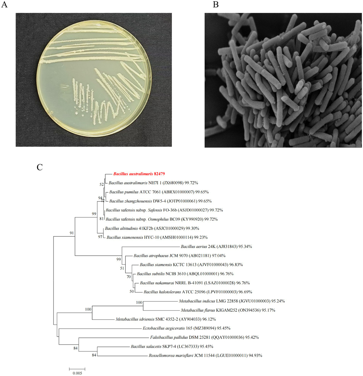Strain TRM82479 formed milky-white, nearly round colonies on LB plates with a glossy surface (Figure 2A). By scanning electron microscopy, its cells were long and cylindrical, 2–4 μm in length, with a smooth cell surface (Figure 2B). The 16S rRNA sequence of strain TRM82479 was compared with those in the EzBioCloud database. We observed a similarity of 99.72% with the 16S rRNA sequence of B. australimaris NH71_1; other 16S rRNA sequences similar to this strain were retrieved and downloaded from the EzBioCloud database, and used to construct a phylogenetic tree. The tree suggests that TRM82479 is most closely related to B. australimaris NH71_1; therefore, the strain was preliminarily identified as B. australimaris TRM82479 (Figure 2C). The 16S rRNA sequence of this strain has been uploaded to NCBI under GenBank accession number PQ423094.
