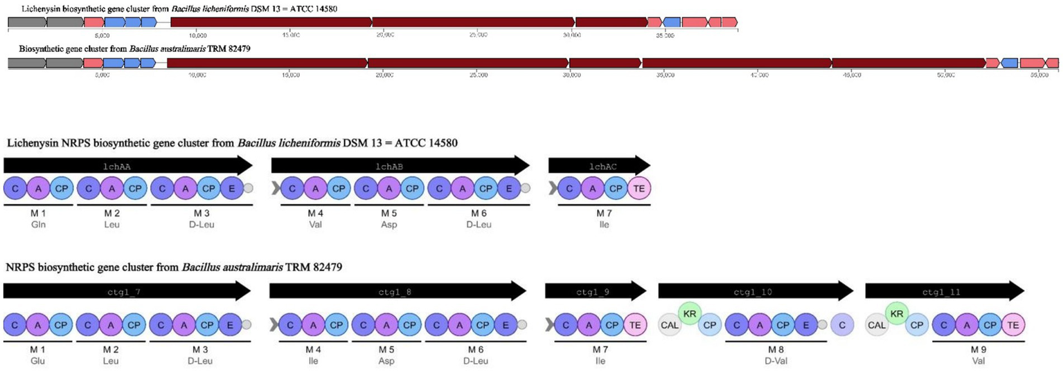 Based on WGS, 12 clusters of secondary metabolite synthesis genes were predicted using the antiSMASH database. Of these, six clusters had higher similarity to known gene clusters, with two associated with fengycin and lichenysin synthesis (Table 2). In a comparison of Cluster 8 with the lichenysin, 92.00% similarity was found. This cluster of includes three NRPS genes, lchAA, lchAB, and lchAC; it is responsible for the synthesis of a lipopeptide containing seven modules: Gln, Leu, D-Leu, Val, Asp, D-Leu, and Ile. In contrast, the cluster of B. australimaris TRM82479 includes multiple gene fragments (ctg1_7, ctg1_8, ctg1_9, ctg1_10, and ctg1_11) and contains nine modules: Glu, Ile, D-Leu, Ile, Asp, D-Leu, Ile, D, and Val. In modules 8 and 9, there were modifier enzyme domains such as CAL and KR, but the last putative esterase gene in the lichenysin biosynthesis gene cluster was not observed. These differences suggest that the TRM82479 lipopeptides are significantly different structurally and functionally from lichenysin (Figure 3). In summary, B. australimaris TRM 82479 may produce lipopeptides that are distinct from fengycin and lichenysin, and lipopeptides have been reported in recent years to have insecticidal activity, we isolated lipopeptides from this strain.