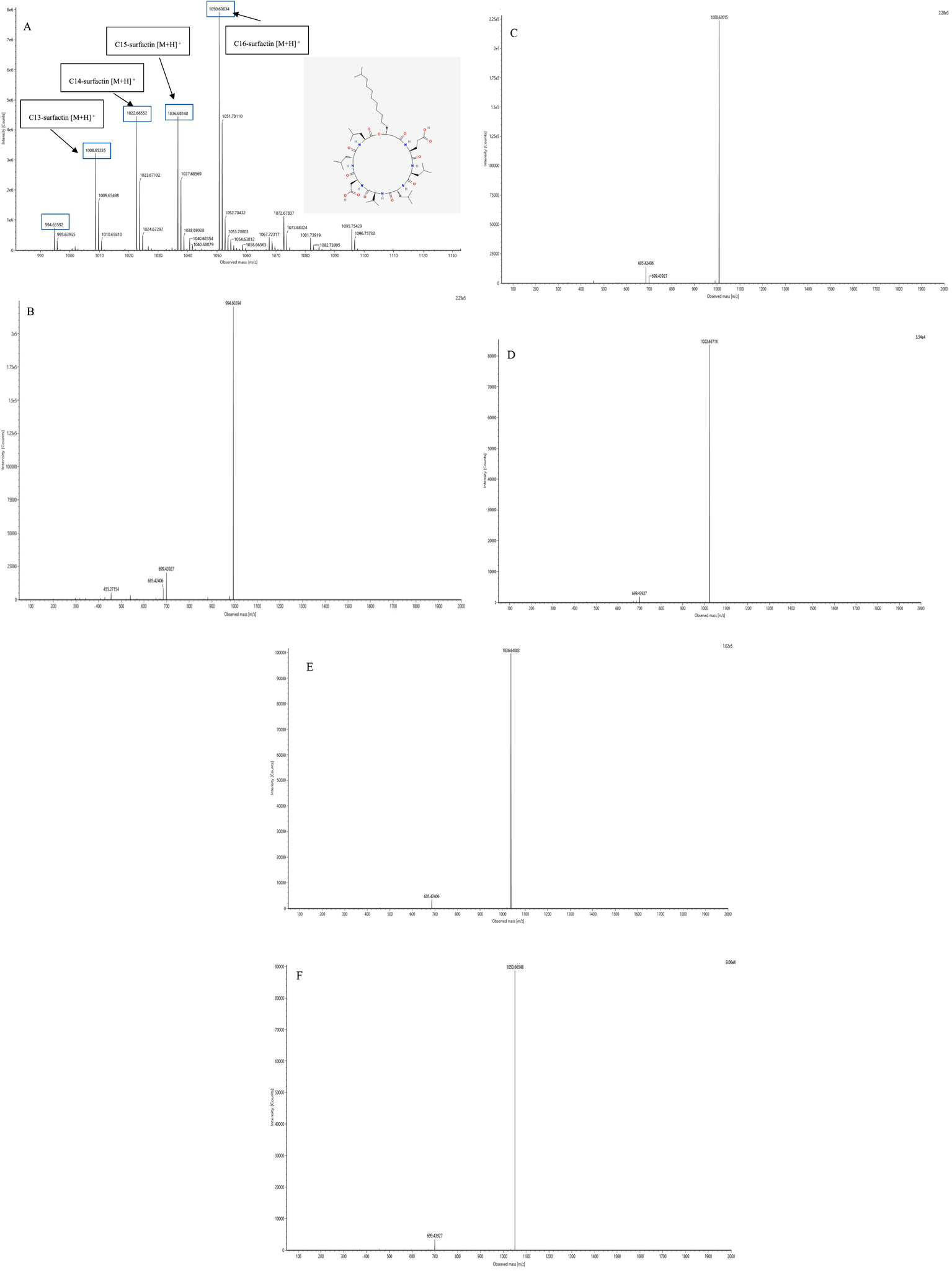 Plot of raw mass spectrometry data for surfactins. (A) Primary mass spectrum and two-dimensional structure of surfactins. (B) Mass: charge ratio (m/z) of 994.6 secondary mass spectra. (C) Mass: charge ratio (m/z) of 1,008.6 secondary mass spectra. (D) Mass: charge ratio (m/z) of 1,022.6 secondary mass spectrometry. (E) Mass: charge ratio (m/z) of 1,036.6 secondary mass spectra. (F) Mass: charge ratio (m/z) of 1,050.6 secondary mass spectra.