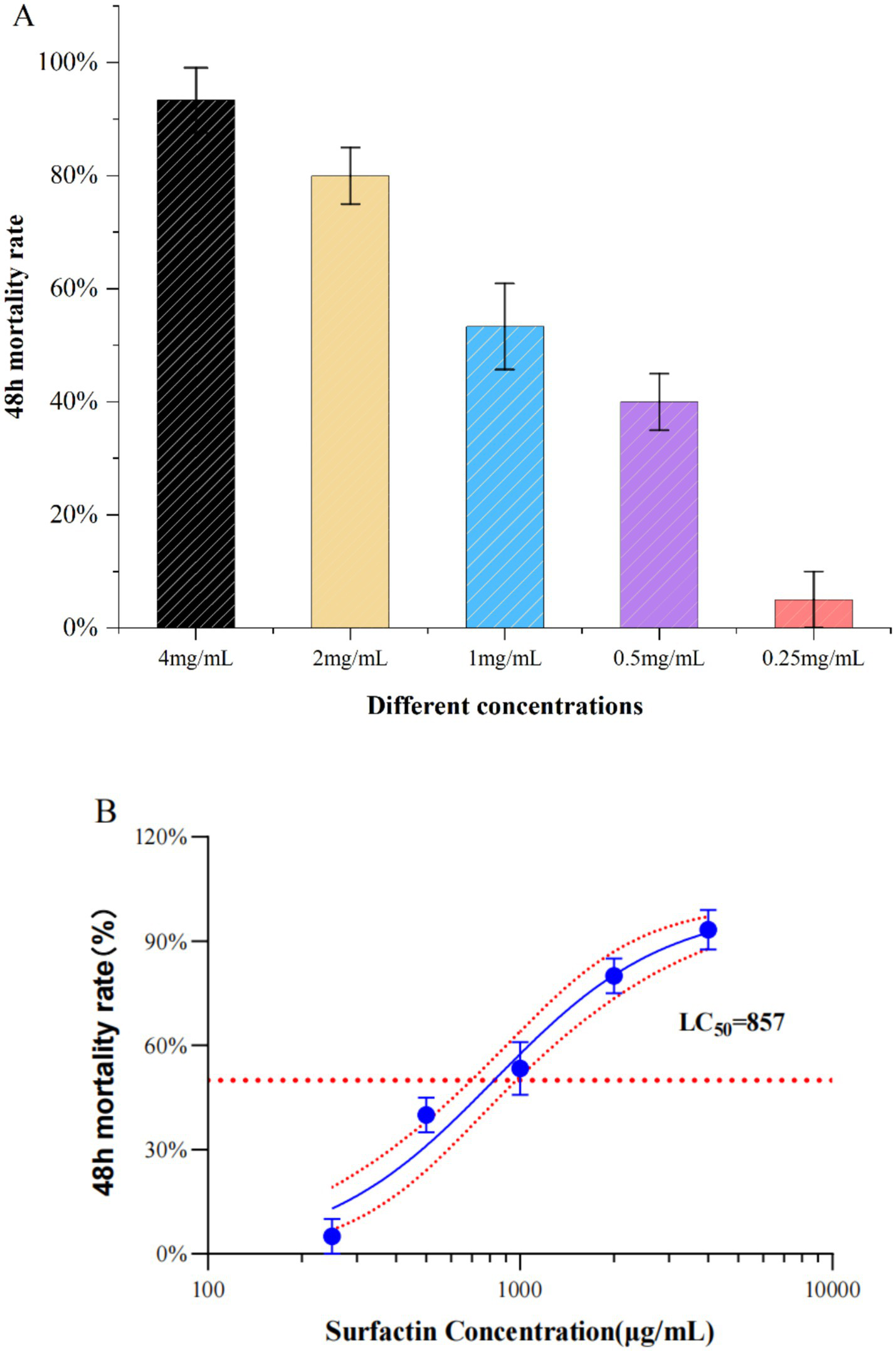 Graph of results of insecticidal activity of surfactins. (A) Effect of different concentration treatments on 48 h mortality of A. gossypii (48 h). (B) LC50 values of Surfactin’s 48 h virulence activity against A. gossypii. (The x-axis represents the surfactin concentration on a logarithmic scale ranging from 100 μg/mL to 10,000 μg/mL, where each division on the axis corresponds to a tenfold increase in concentration).