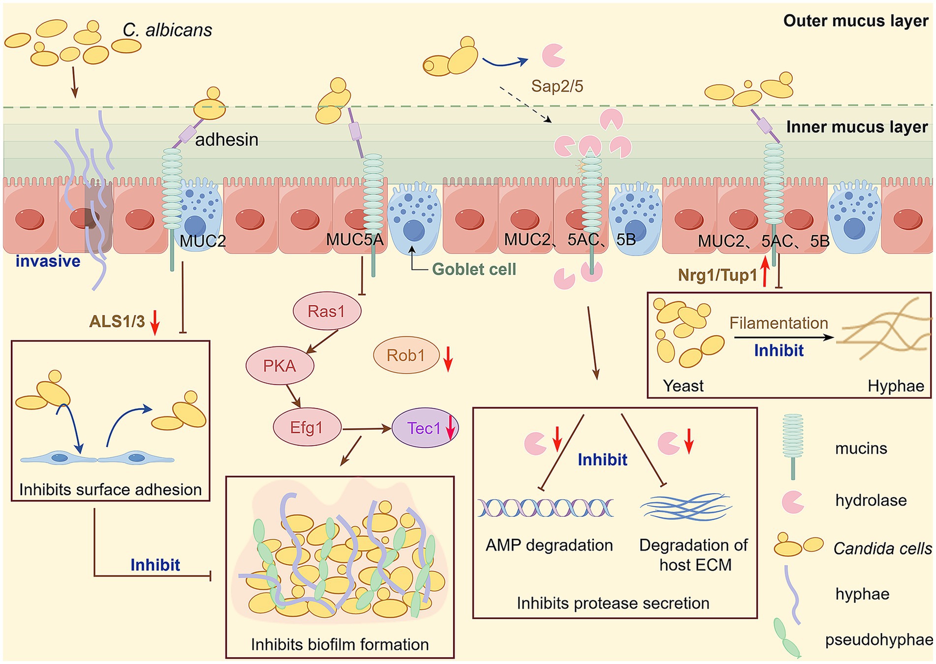 In summary, mucins inhibit biofilm growth through two mechanisms: (1) inducing transcriptional responses that downregulate key biofilm-associated regulatory genes, and (2) interfering with fungal attachment and detachment processes (Figure 1).