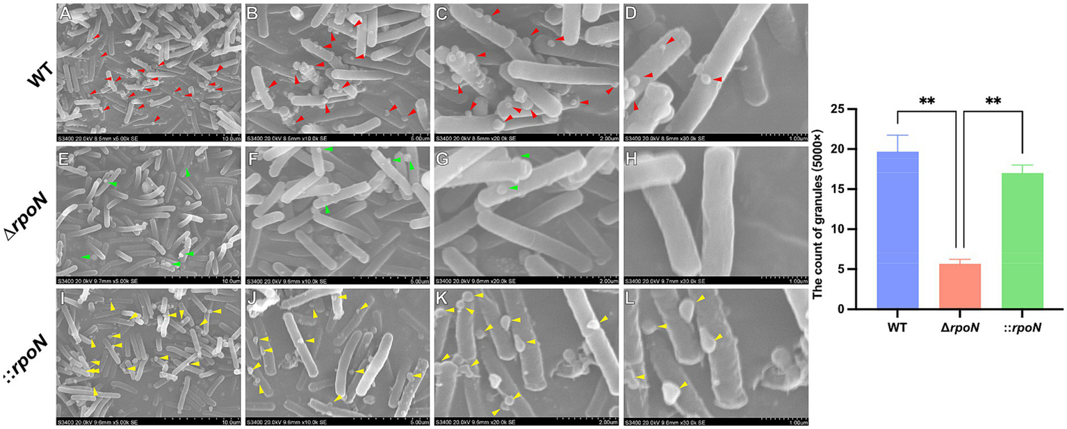 Surface morphology of WT, ∆rpoN and ⸬rpoN strains viewed by Scanning Electron Microscopy. (A–D) Cell surface morphology of the WT strain under ×5,000 (A), ×10,000 (B), ×20,000 (C), and ×30,000 (D) magnifications; (E–H) Cell surface morphology of ∆rpoN strain under ×5,000 (E), ×10,000 (F), ×20,000 (G), and ×30,000 (H) magnifications; (I–L) Cell surface morphology of ⸬rpoN strain under ×5,000 (I), ×10,000 (J), ×20,000 (K), and ×30,000 (L) magnifications. The arrows indicate cell surface deposits (granules). The blue, red, and green bars represent the number of granules in WT, ΔrpoN, and ⸬rpoN strains, respectively (Three fields of view at ×5,000 were selected, and each view was counted three times).