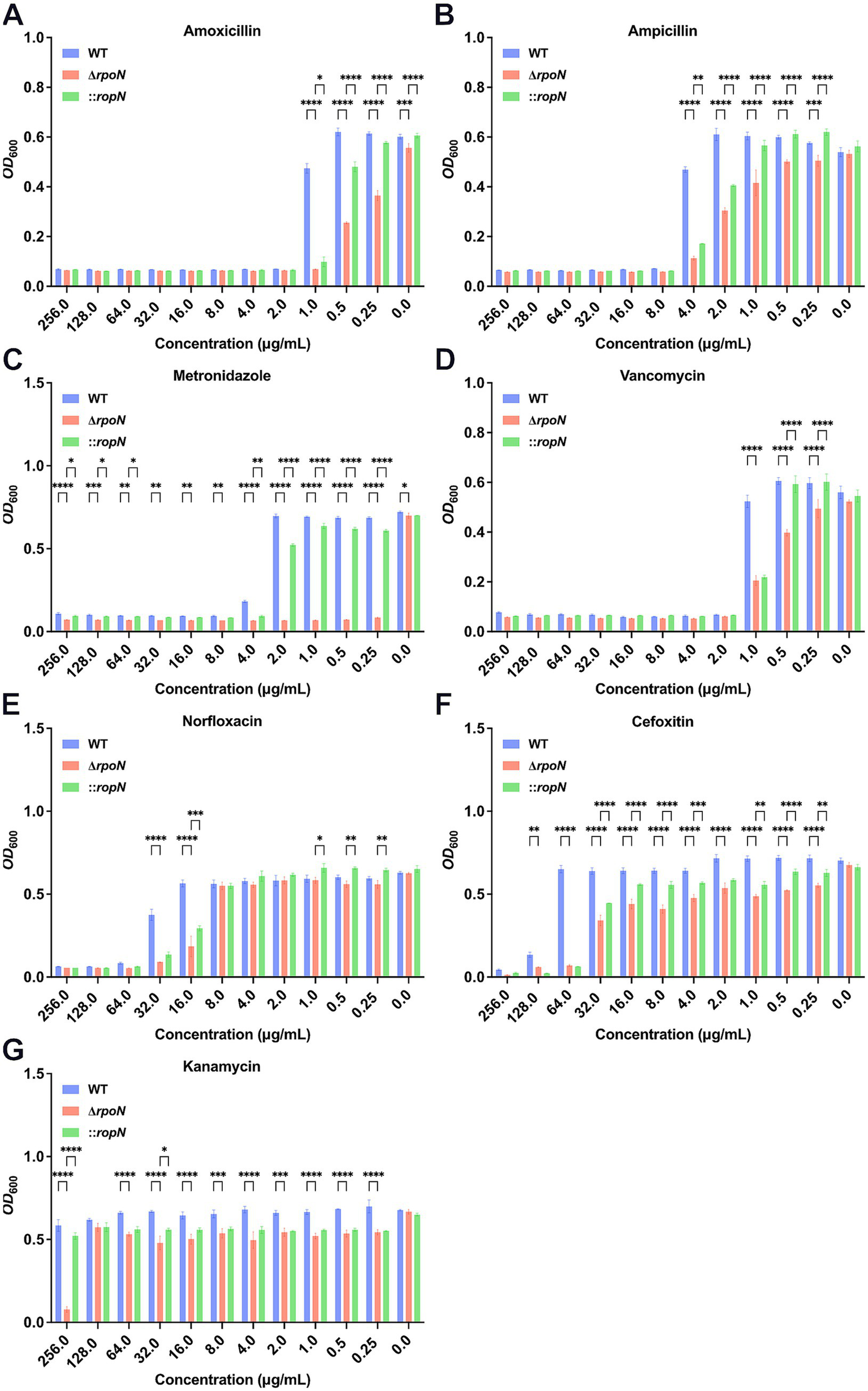 Antibiotic susceptibility of WT, ∆rpoN, and ⸬rpoN strains. The vertical axis represents the OD600 value, while the horizontal axis represents the concentration of different antibiotics (mg/mL). The blue, red, and green bars indicate the OD600 values of WT, ΔrpoN, and ⸬rpoN strains at different antibiotic concentrations. Compared to WT, the ΔrpoN strain exhibited significantly decreased susceptibility to amoxicillin (A), ampicillin (B), metronidazole (C), vancomycin (D), norfloxacin (E), cefotetan (F), and kanamycin (G), whereas the ⸬rpoN strain showed partial restoration of susceptibility to these antibiotics compared to WT.