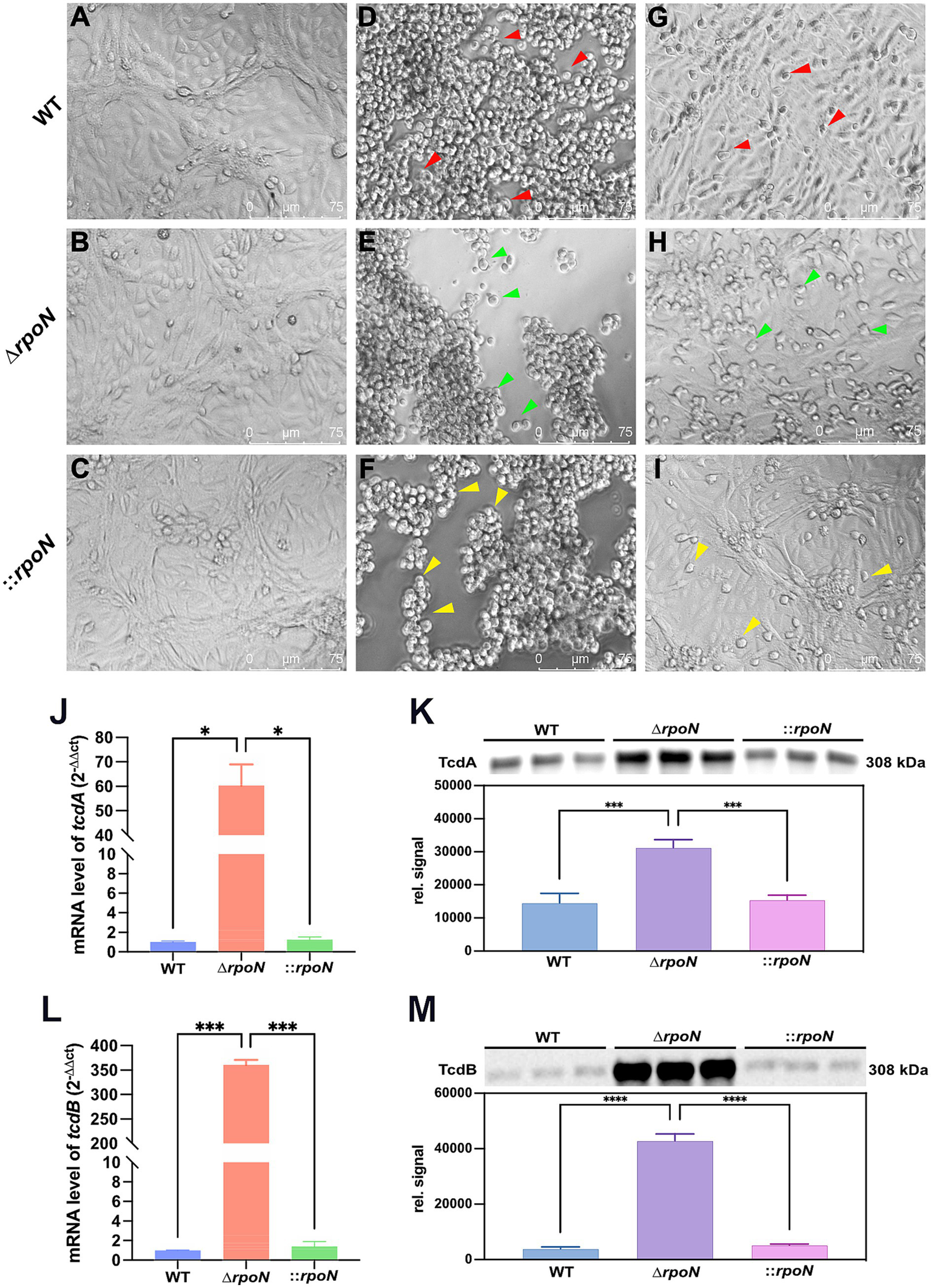 Cell toxicity of WT, ∆rpoN and ⸬rpoN strains. Supernatants of each strain were co-cultured with Vero cells, and morphological changes of Vero cells were observed under a light microscope. (A–C) Show the PBS control without toxins, where cells exhibit a healthy spindle shape. Vero cells cocultured with undiluted WT (D), ∆rpoN(E), and ⸬rpoN(F) supernatants became rounded and suspended (red, green, and yellow arrows); (G) Shows the results of Vero cells co-cultured with WT supernatant toxin diluted 0.5 × 107 times; (H) Shows the results of Vero cells co-cultured with ∆rpoN supernatant toxin diluted 0.5 × 109 times; (I) Shows the results of Vero cells co-cultured with ⸬rpoN supernatant toxin diluted 0.5 × 108 times; (J,L) Blue, red, and green bars represent the expression levels of tcdA or tcdB genes in WT, ∆rpoN, and ⸬rpoN strains, respectively; (K,M) Blue, purple, and pink bars represent the expression levels of TcdA or TcdB proteins in WT, ∆rpoN, and ⸬rpoN strains (detected by western blot), respectively.