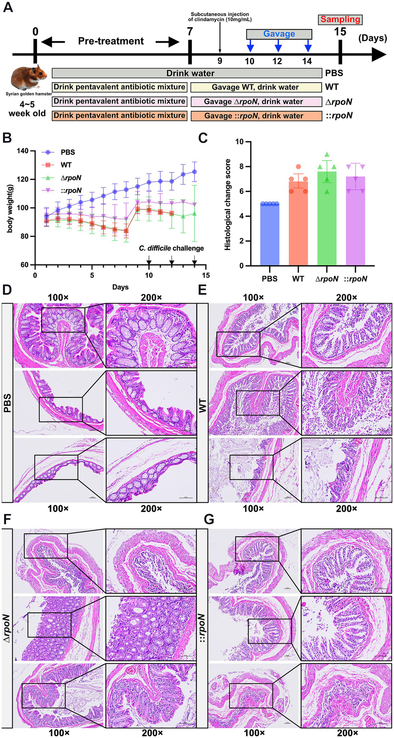 Syrian golden hamsters (4–5 weeks old, ~100 g) were purchased from Liaoning Changsheng Biotechnology Co., Ltd. and housed 5 per cage with ad libitum access to food and water. Hamsters were acclimated for 1 week prior to the experiment. To disrupt the gut microbiota, hamsters in the experimental groups (WT, ΔrpoN, and ⸬rpoN) were administered a cocktail of antibiotics (kanamycin 0.8 mg/mL, gentamicin 0.07 mg/mL, polymyxin B 0.1135 mg/mL, metronidazole 0.43 mg/mL, and vancomycin 0.09 mg/mL) in drinking water for 7 days (Chen et al., 2008; Geeraerts et al., 2015; Mooyottu et al., 2017). Control animals received PBS. On day 9, all hamsters were subcutaneously injected with clindamycin (10 mg/kg) to further perturb the gut microbiota (Chen et al., 2008). On days 10, 12, and 14 post-clindamycin injection, hamsters were gavaged with different Clostridioides difficile strains or PBS (control). Each hamster received 100 μL of bacterial suspension (OD600 = 0.6, 4 × 105 CFU/mL). Body weight and fecal consistency were monitored daily.