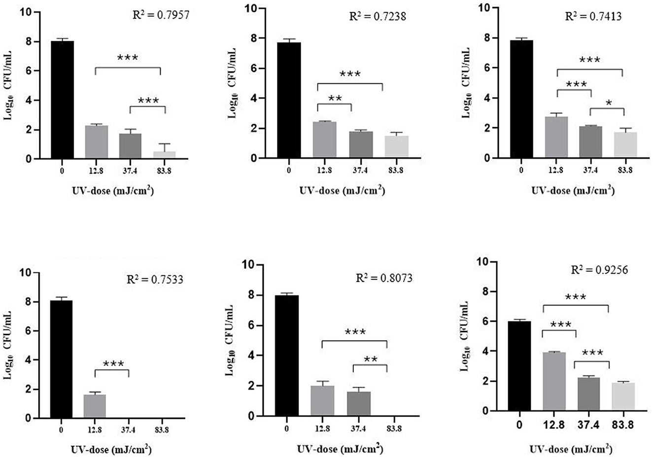 Figure 1. Log10 microbial load (CFU/mL) of MSSA, MRSA, MRSE, E. coli, P. aeruginosa, and C. albicans strains obtained onto solid medium applying a UV-dose of 0 (control), 12.8, 37.4, and 83.8 mJ/cm2. Bar charts are shown as mean ± standard deviation (SD). Mean values ± SD from three independent experiments (n = 3, for each experimental condition) (3 independent experiments). 2way ANOVA, *p < 0.05; **p < 0.01; ***p < 0.001.