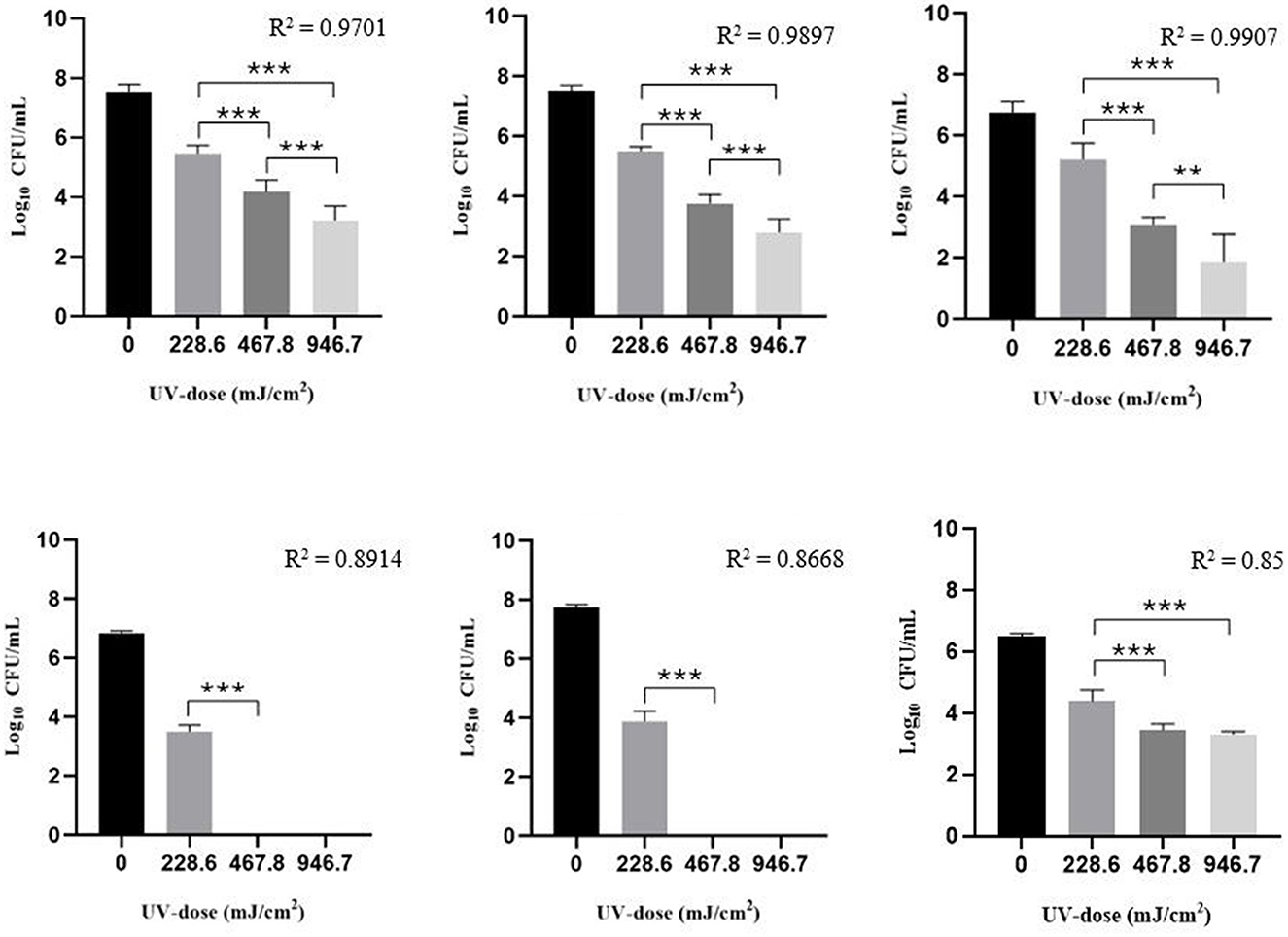 Figure 3. Survival of MSSA, MRSA, MRSE, E. coli, P. aeruginosa, and C. albicans cells grown in a 24h-biofilm on stainless steel discs after exposure to UV-C irradiation applying a UV-dose of 0 (control), 228.6, 467.8, and 946.7 mJ/cm2 on each disc side. Bar charts are shown as mean ± standard deviation (SD) from three independent experiments (n = 3, for each experimental condition) (3 independent experiments). 2way ANOVA, **p < 0.01; ***p < 0.001.
