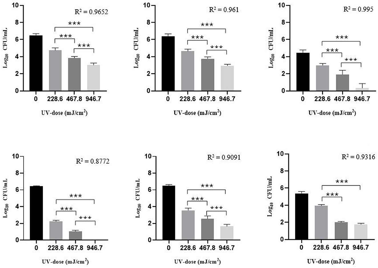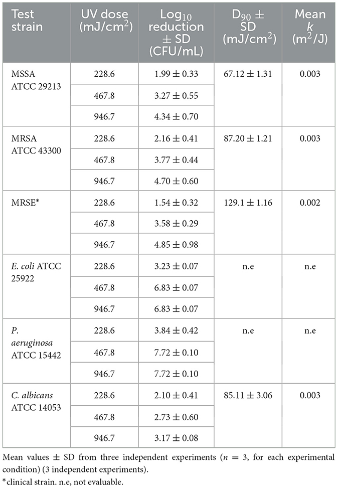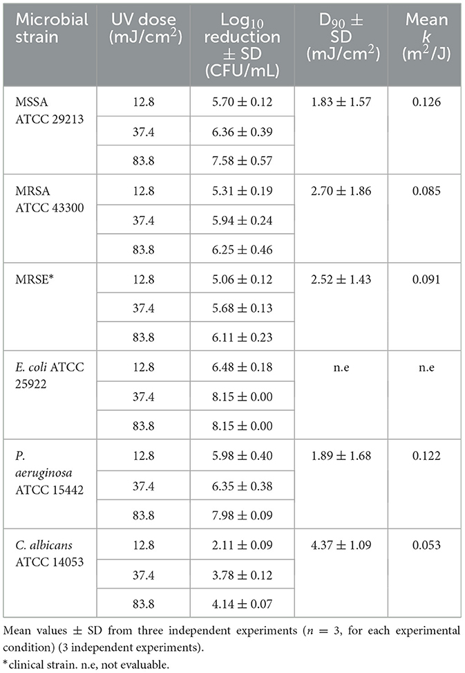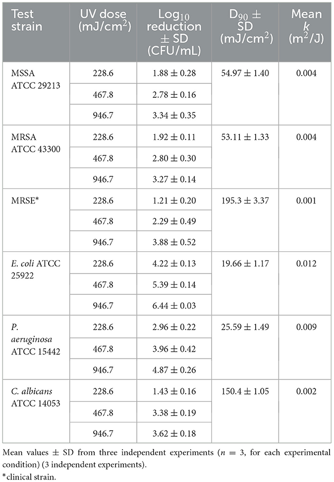 Table 2. Log10 reduction ± standard deviation (SD) (CFU/mL) and D90 ± SD of each tested strain, in planktonic culture, in relation to the UV dose used, and mean UV Inactivation Constant (k) obtained.