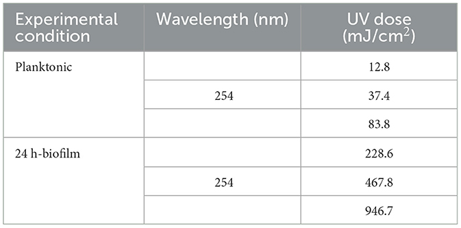 Sessile cell: To form a biofilm, 100 μl of each bacteria or yeast suspension was inoculated into the 96-well cell culture microtiter plates and incubated at 37 °C for 24 h. Each biofilm was washed gently three times with PBS to remove any non-adhered cells and, before the UV treatment, the PBS was removed. Once the biofilms on the wells were dried, the wells were treated with three different UV doses, which are shown in Table 1. After the UV treatment, the content of the wells was scraped, resuspended in PBS, and cultured on a solid medium in serial dilutions. Plates were then incubated for 24 h at 37°C, and then the CFU/mL was calculated.