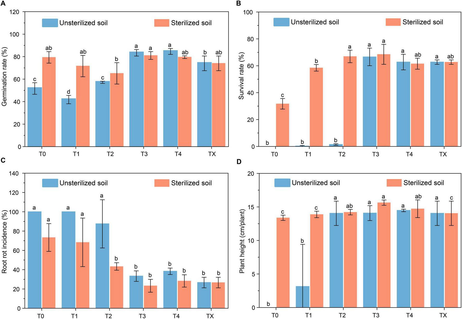 Figure 1. Effect of tetramycin on alleviating root rot disease of P. notoginseng. (A) Effects of tetramycin on the germination rate. (B) Effects of tetramycin on the survival rate. (C) Effects of tetramycin on the root rot incidence. (D) Effects of tetramycin on the plant height. Different lowercase letters indicate significant differences within groups, p < 0.05. The data in the figure are the mean ± standard deviation of four biological replicates. The p-values were calculated using a one-way analysis of variance and multiple comparisons. T0: water; T1: tetramycin 2000×; T2: 1000×; T3: tetramycin 500×; T4: tetramycin 250×; TX: new soil under the forest.