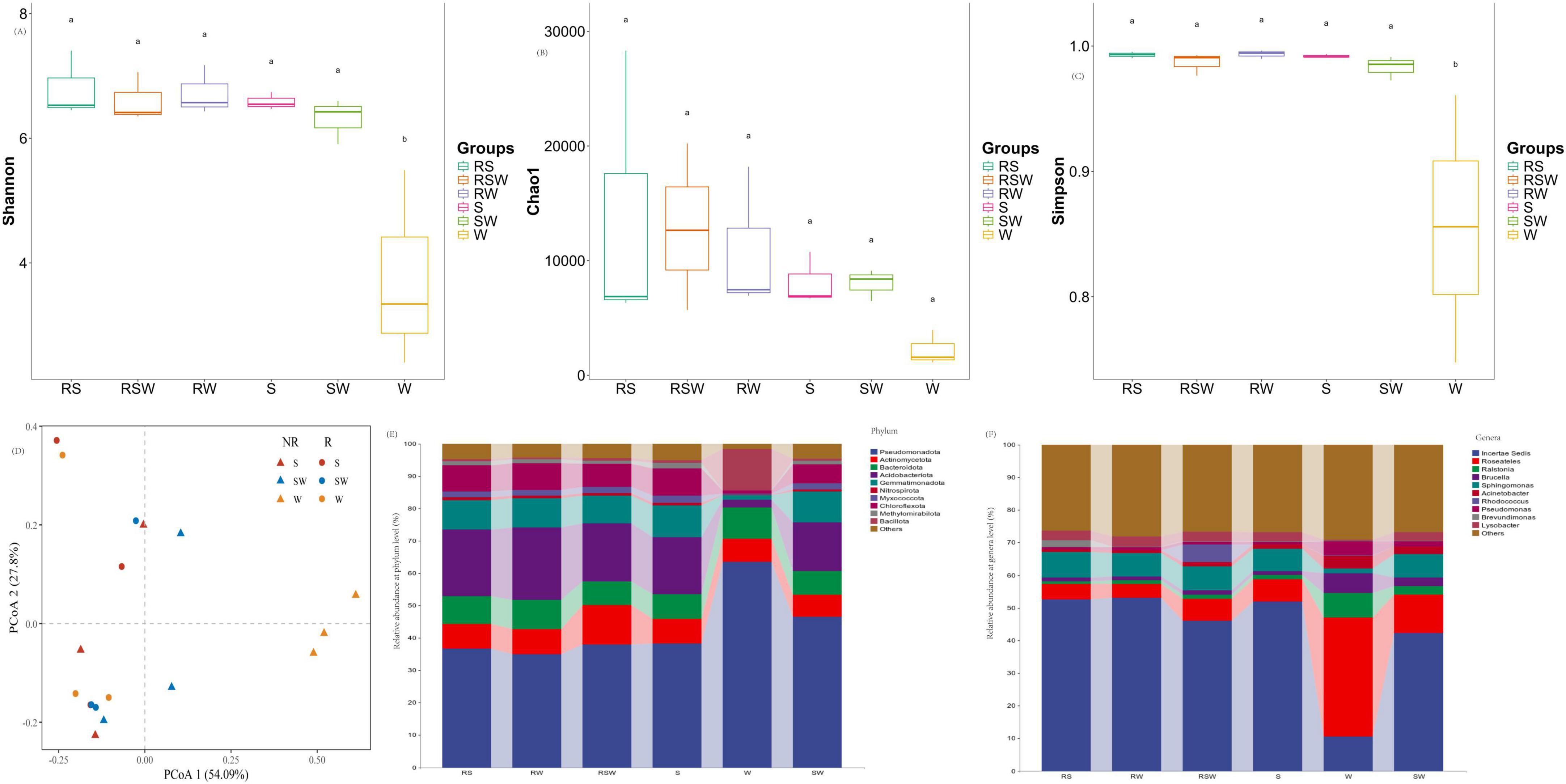 Figure 1. Effect of sampling location and intercropping systems on α-diversity of soil bacterial (ANOVA followed by LSD test; p < 0.05). (A) Represented Shannon diversity index, (B) represented Chao 1, (C) represented simpson index, (D) represented unconstrained PCoA (PCo1 and PCo2) with Bray–Curtis distance showing the soil bacterial of the RS, RW, RSW, S, W, and SW samples. (E) Represented relative abundance of soil bacterial at phylum level, (F) represented relative abundance of soil bacterial at genus level.