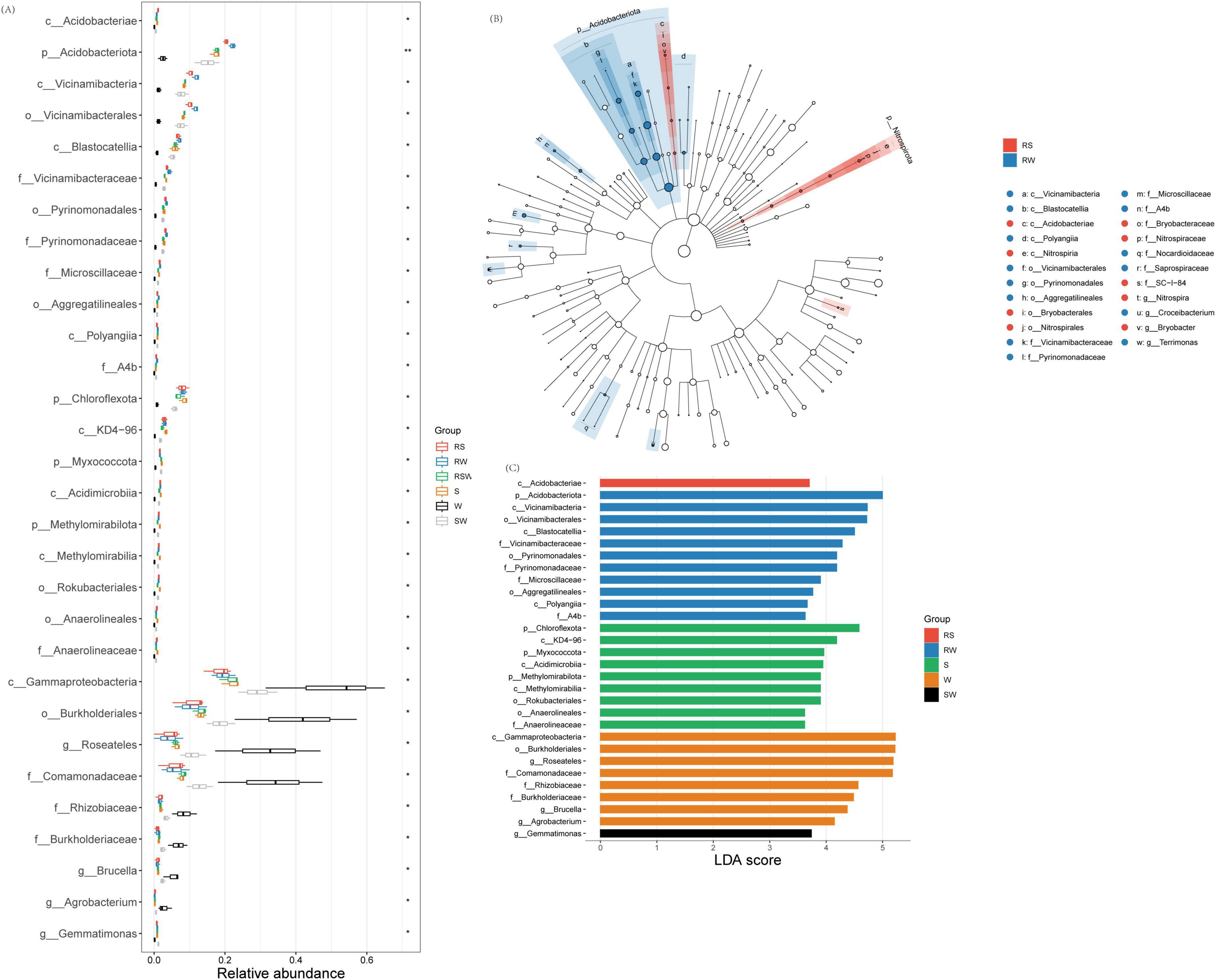 Diagram showing microbial data analysis. Panel (A) displays a stacked bar chart of various microbial taxa sorted by relative abundance across six groups. Panel (B) is a phylogenetic tree highlighting relationships among taxa with color-coded branches. Panel (C) presents a horizontal bar chart with LDA scores, indicating taxa significance across groups. Color legend identifies group categories RS, RW, RSA, S, W, and SW.