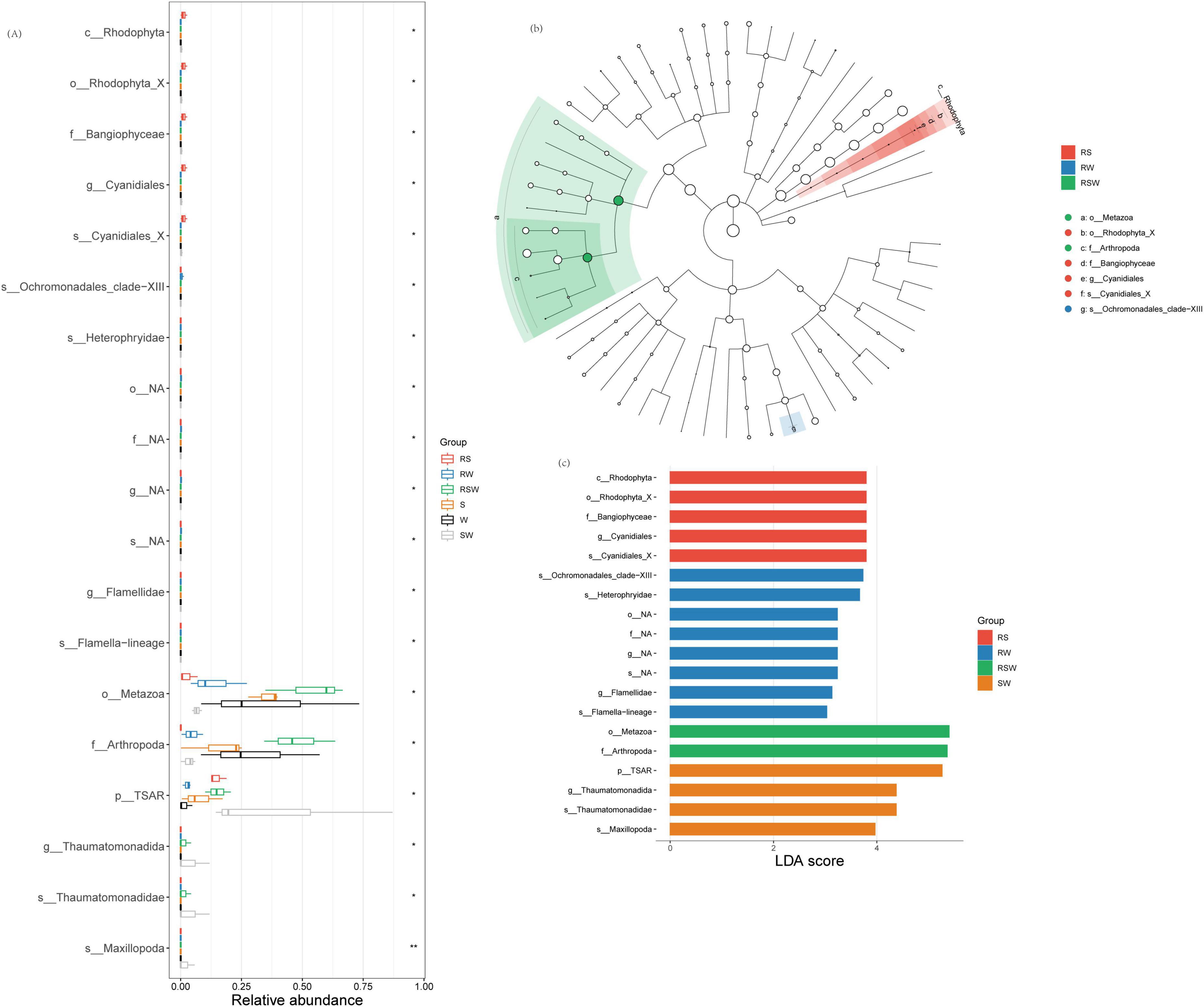 Diagram with three panels: (a) Box plot showing relative abundance across multiple taxa groups, differentiated by colored lines for six groups (RS, RW, RSW, S, W, SW). (b) Phylogenetic tree highlighting relationships between groups, color-coded in green, red, and blue. (c) Bar chart displaying LDA scores for various taxa, colored by group affiliation, indicating significance in differentiation. Legends describe color-group associations.