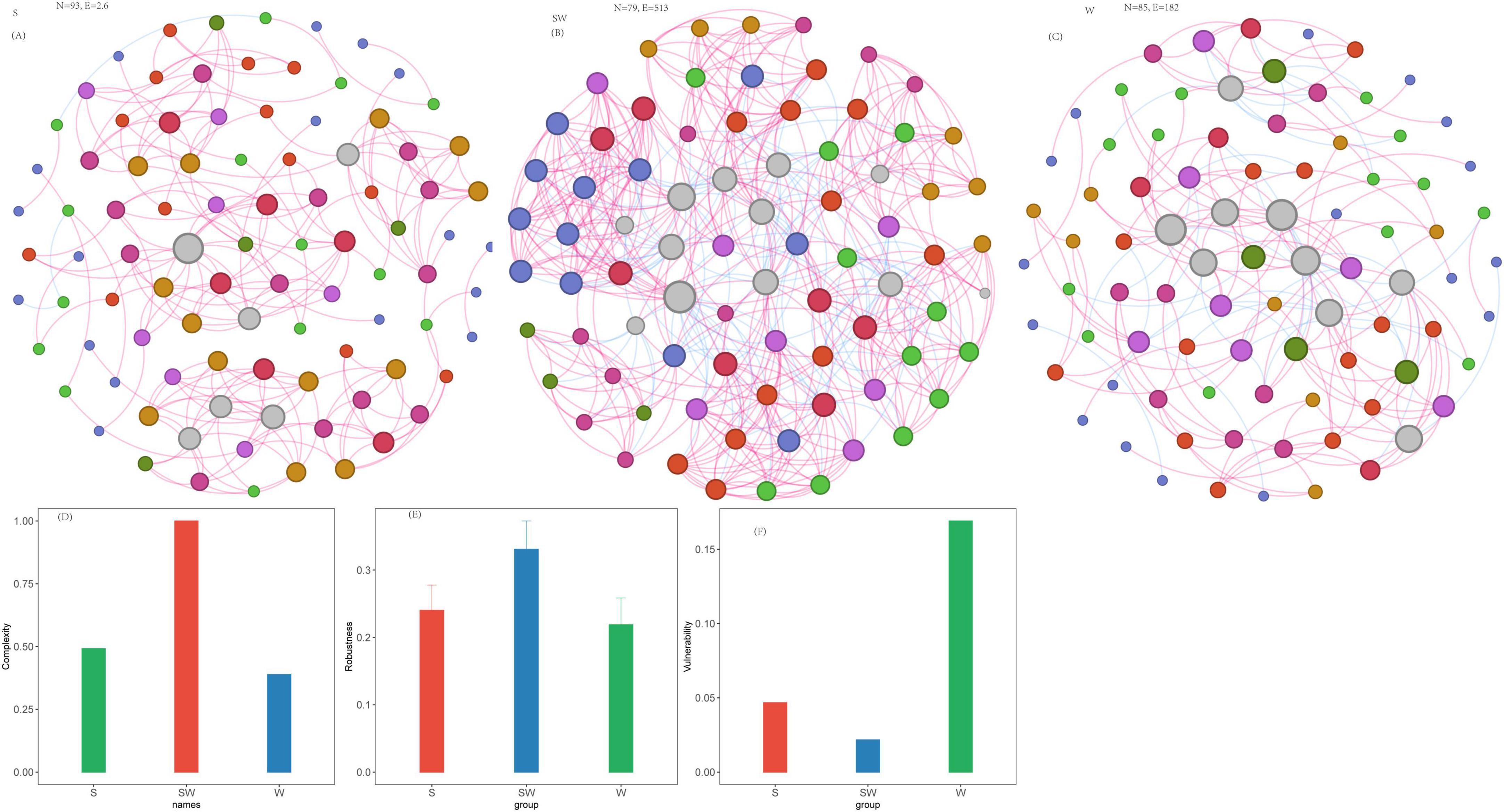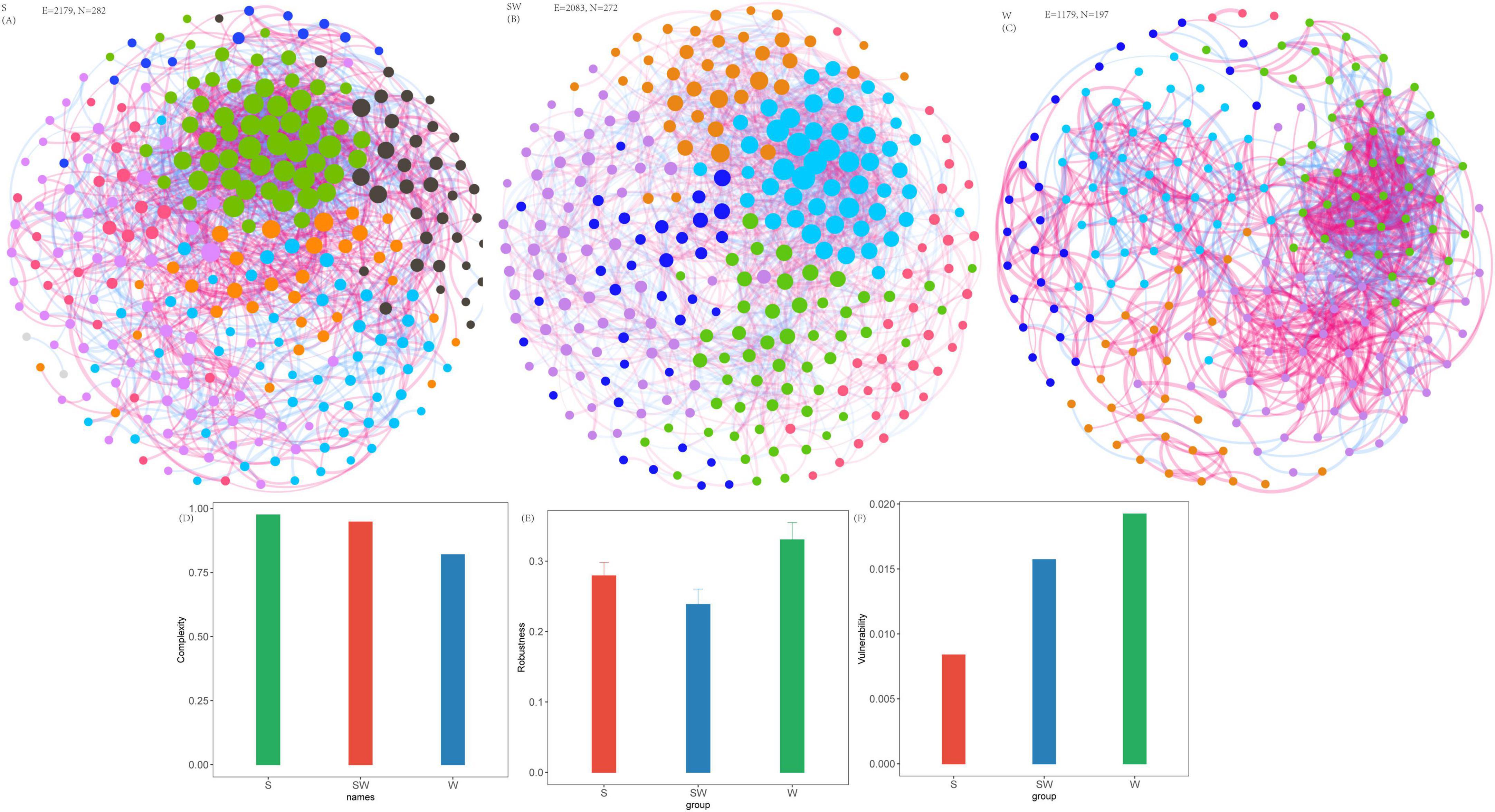 Figure 5. Soil eukaryotic network, network complexity index and stability under different intercropping systems. (A) Soil eukaryotic network under soybean monoculture (S). (B) Soil eukaryotic network under wheat intercropped with soybean (SW). (C) Soil eukaryotic network under wheat monoculture (W). (D) Network complexity index. (E) Robustness calculated as 50% of the taxa randomly removed from each network. (F) Network vulnerability. Where nodes indicate different ASVs, and edges between the nodes indicate significant interactions. Node colors represent different phylum, and the node size represents the number of degrees connected with the node. Link colors represent the various interactions between soil microbial species, including positive (red) and negative (blue) interactions.