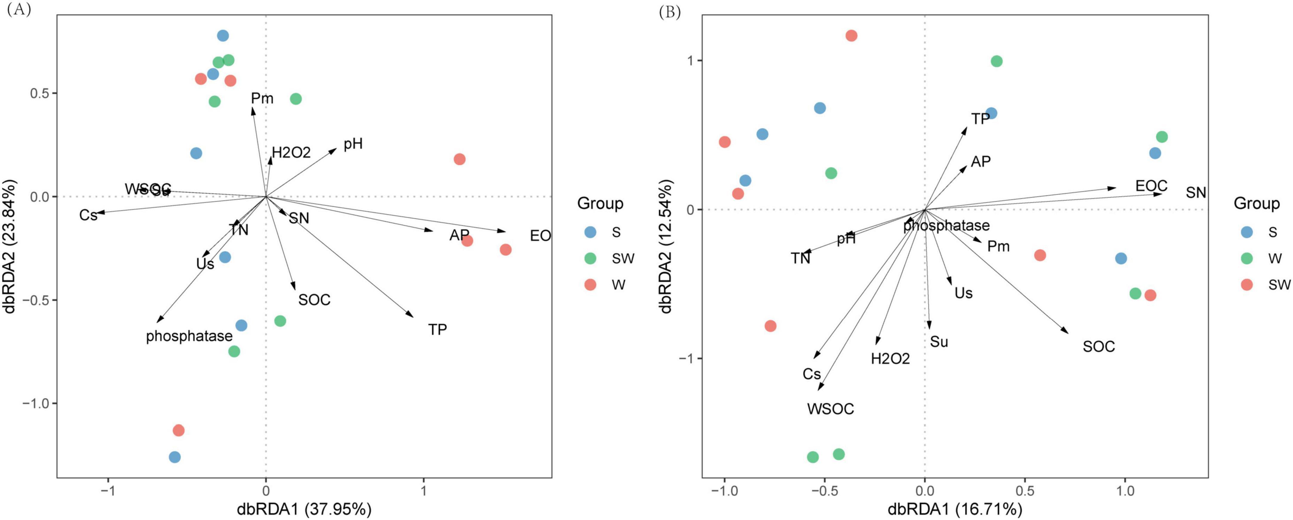 Two dbRDA plots (A and B) illustrate relationships between environmental variables and sample groups. Axes labeled dbRDA1 and dbRDA2 show percentage variability explained. Each plot contains colored dots representing groups S, SW, and W. Arrows indicate variables like phosphatase, AP, SN, pH, and hydrogen peroxide, illustrating their correlations. A legend differentiates groups by color.