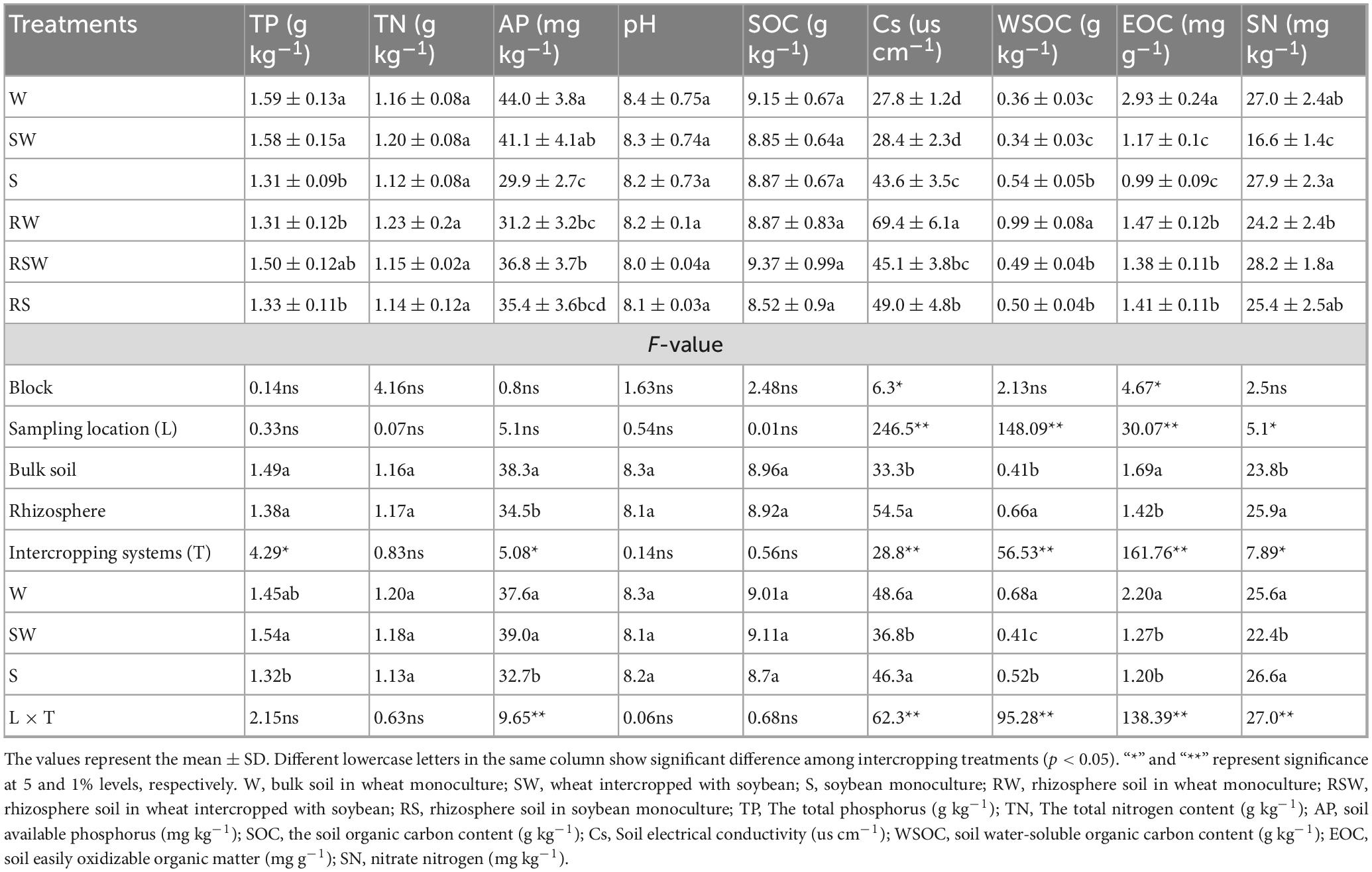 Soils under the SW treatment had a 20.6% higher TP content compared to the S treatment (Table 1). There was no difference in TP between the RSW and RS treatments. Intercropping and soil sampling location had no significant effects on TN, SOC, and pH. The intercropping treatment tended to have a higher AP content than the monocropping treatments. Rhizosphere soil also typically had a higher AP content than bulk soil. Intercropped soil generally had lower Cs than monocropping treatments. Rhizosphere soil had higher Cs than bulk soil. Intercropped soil had lower WSOC than monocropped soil. Rhizosphere soil had a higher WSOC content than bulk soil. Intercropped soil had a lower EOC than monocropped soil. Rhizosphere soil had a lower EOC than bulk soil. Intercropped soil had a lower SN than monocropped soil. Rhizosphere soil had a higher SN than bulk soil.
