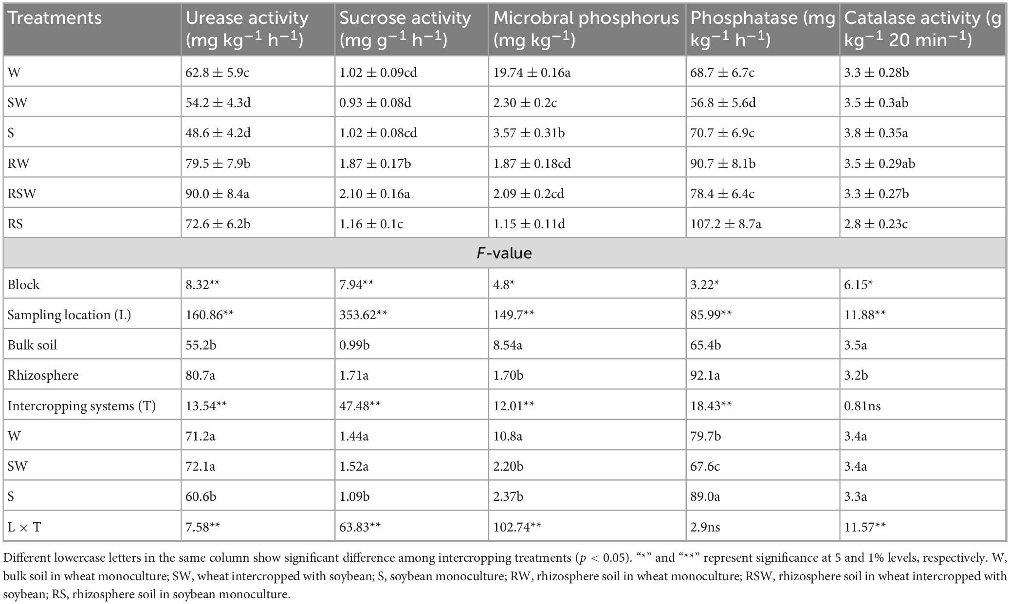 SPSS software version 17.0 was used to perform a two-factor analysis of variance (ANOVA) to assess the effects of different intercropping configurations on the soil chemical characteristics, enzymatic activities, and microbial phosphorus (Pm). One factor was the sampling location: rhizosphere or bulk soil, and the other factor was the intercropping system: W, S, or SW. Sequencing data analysis was carried out utilizing QIIME2 (Bolyen et al., 2019) and R software, version 4.4.1. The reads were trimmed and filtered to remove low-quality sequences.