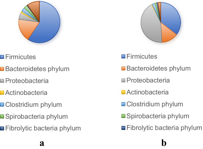 The intestinal tracts of horses and donkeys are predominantly colonized by two major bacterial phyla: Firmicutes and Bacteroidetes, which collectively constitute the majority of the microbial community (Zhang et al., 2022c). Notably, Liu (2020) demonstrated significant interspecies variations in the relative abundance of these dominant phyla, reporting that Firmicutes and Bacteroidetes account for 87.91 and 78.50% of the total microbial population in donkeys and horses, respectively. Furthermore, the ratio of Firmicutes to Bacteroidetes differs markedly between these species. In donkeys, this ratio approximates 1:1, whereas in horses, it is approximately 0.8:1. These proportional differences are of particular significance, as they are believed to influence the host’s capacity for energy extraction from dietary sources and may consequently be associated with metabolic conditions such as obesity. Specifically, an elevated proportion of Firmicutes relative to Bacteroidetes has been correlated with enhanced energy harvesting capabilities from the diet.