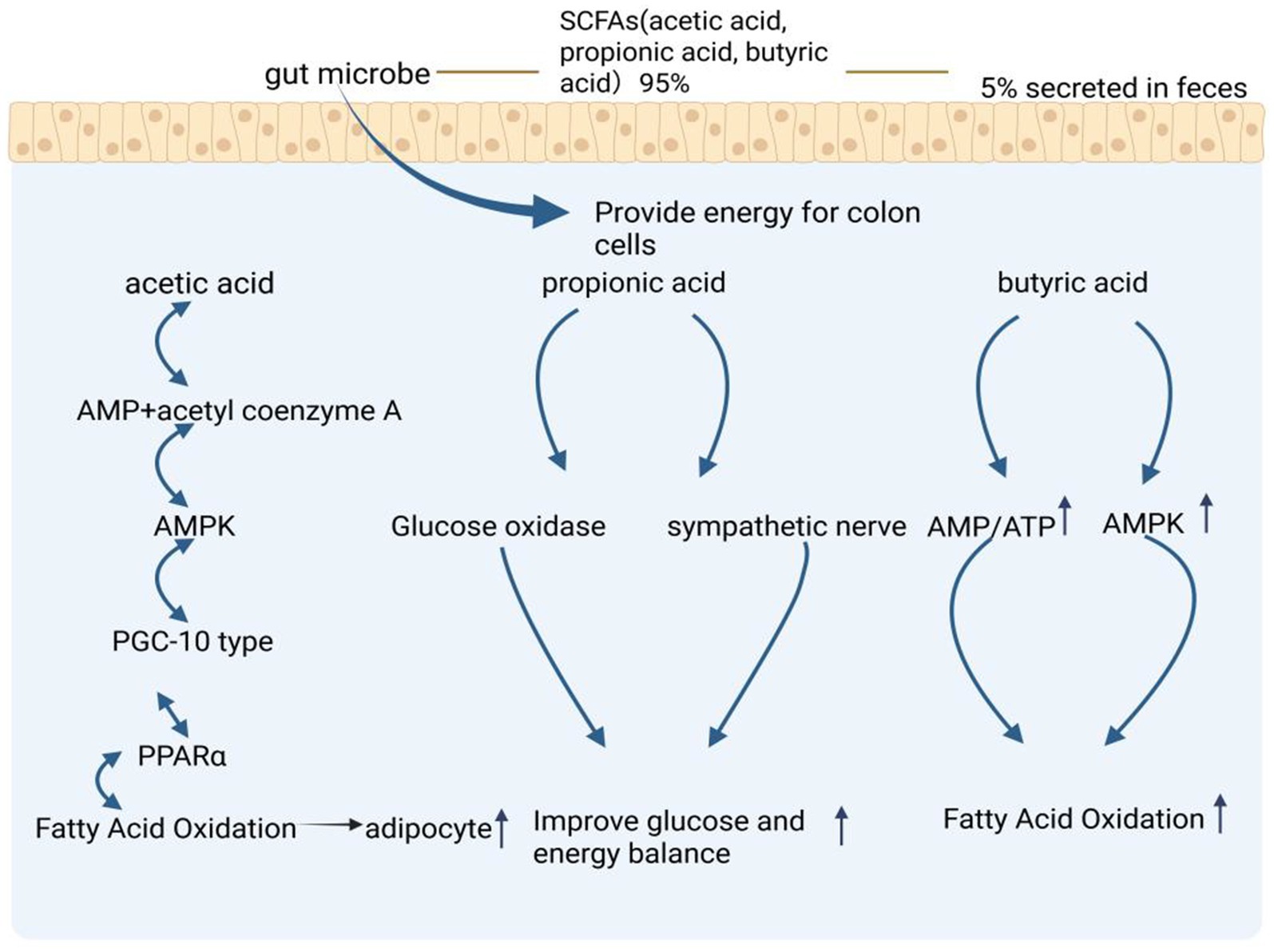 Figure 2. Regulation of lipid metabolism mechanism by short chain volatile acids (SCFAs) produced by gut microbiota metabolism. The metabolic pathways of SCFAs- specifically acetic acid, propionic acid, and butyric acid - which are produced by gut microbes, with 95% utilized by colon cells and 5% secreted in feces. The figure shows three main pathways: the acetic acid pathway leading to fatty acid oxidation through AMPK and PPARα, the propionic acid pathway improving glucose and energy balance via glucose oxidase and sympathetic nerve activation, and the butyric acid pathway enhancing fatty acid oxidation through AMP/ATP and AMPK signaling. The figure is created with BioRender.com.