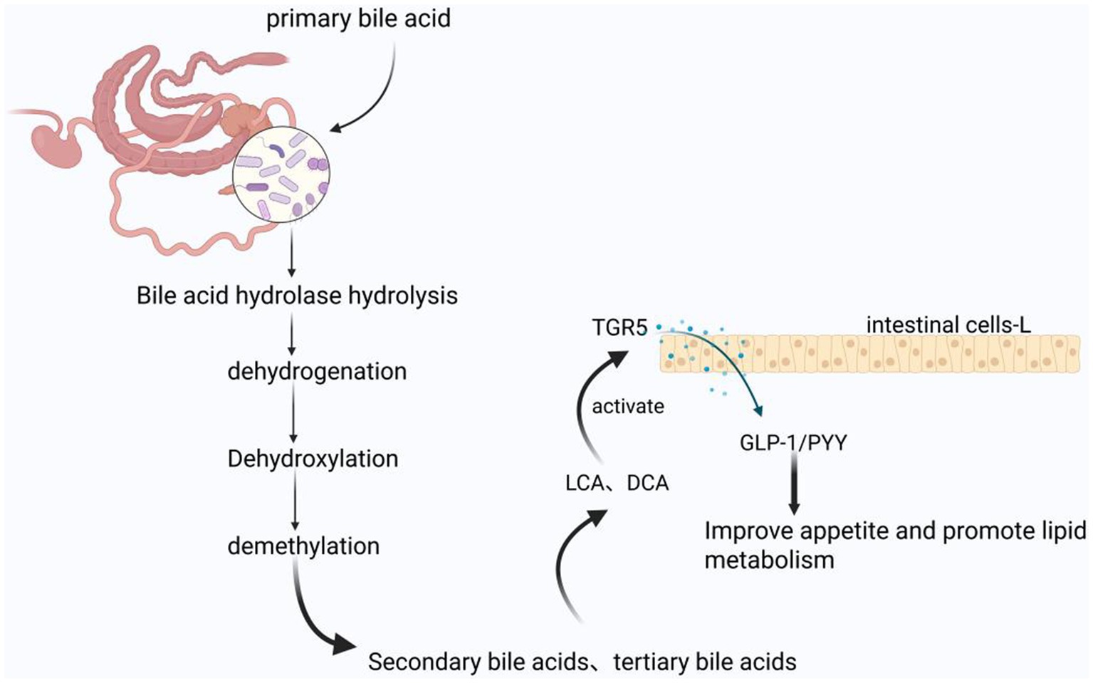 Figure 3. Bile acid regulated lipid metabolism mechanism produced by gut microbiota metabolism in equine animals: The products produced by microbial hydrolysis, hydrogenation, dehydroxylation, and demethylation of primary bile acids are activators of TGR5, thereby improving animal appetite and lipid metabolism. The figure is created with BioRender.com.