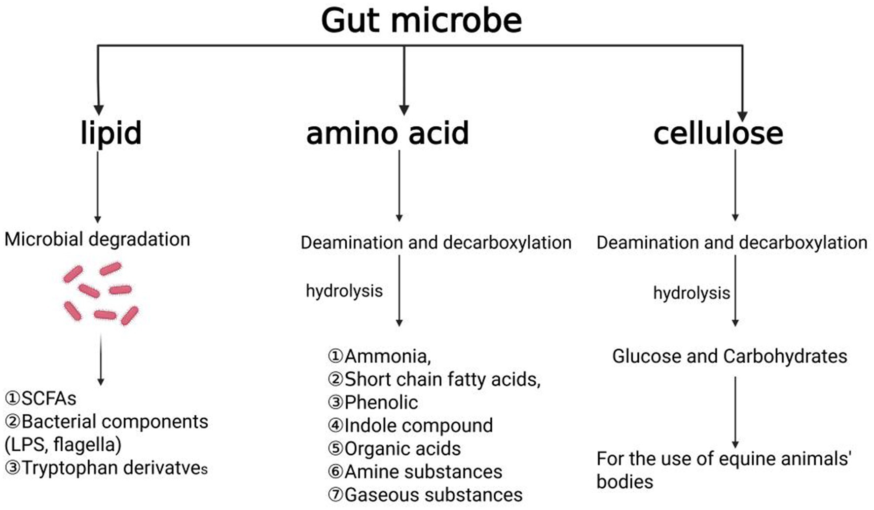 Figure 4. Summary of digestion and degradation of three major nutrients in feed by equine animals, including lipid, amino acid and cellulose. The figure is created with BioRender.com.