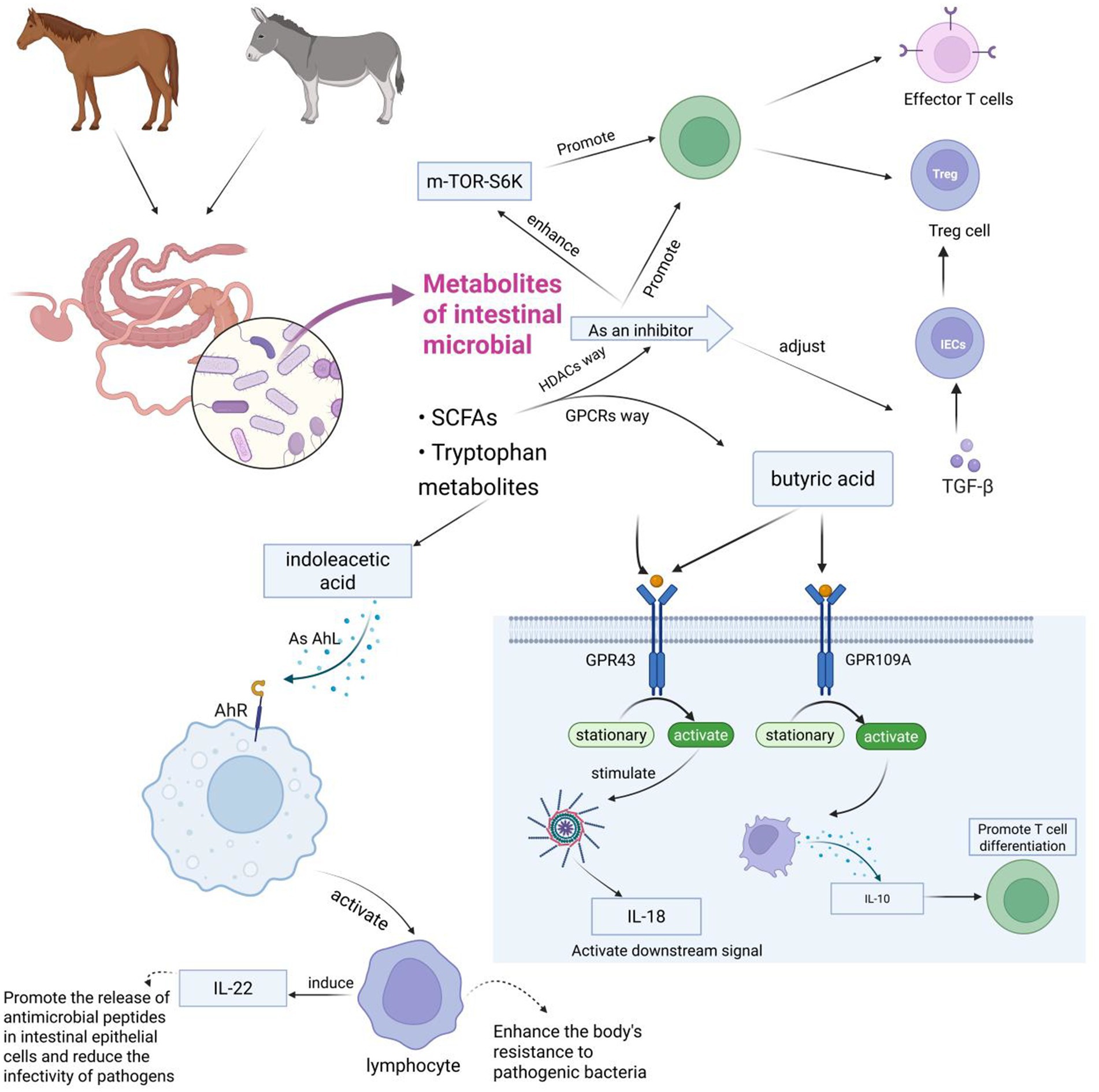 Figure 5. This figure illustrates how intestinal microbial metabolites (primarily SCFAs and tryptophan metabolites) from horses and donkeys influence immune responses through various signaling pathways. The diagram shows several key pathways: the mTOR-S6K pathway affecting T cells (Effector T cells and Treg cells), the butyric acid pathway working through GPR43 and GPR109A receptors to produce IL-1β and IL-10 respectively, and the indoleacetic acid pathway activating AHR to stimulate lymphocytes and IL-22 production, ultimately enhancing antimicrobial defense and T cell differentiation. The figure is created with BioRender.com.
