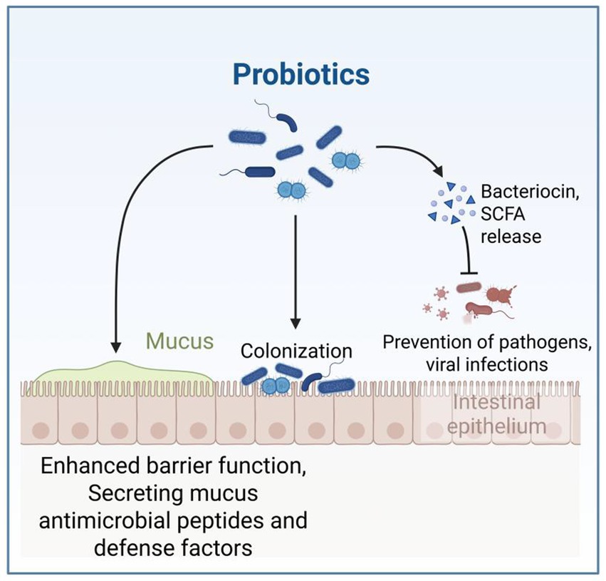 Figure 6. This figure demonstrates how probiotics function in the intestinal environment, showing their dual mechanisms of action: direct colonization of the intestinal epithelium and enhancement of the mucosal barrier through bacteriocin/SCFA production that prevents pathogen invasion. The figure is created with BioRender.com.