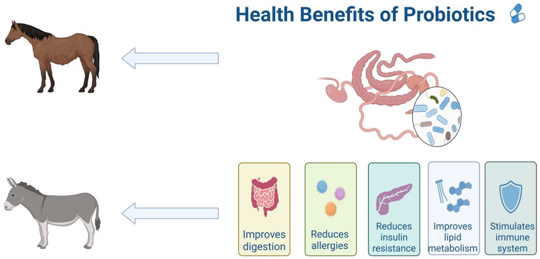 Figure 7. Benefits of probiotics in the gut for equine animals, including improved digestion, reduced allergies, reduced insulin resistance, improved lipid metabolism and stimulated immune system. The figure is created with BioRender.com.