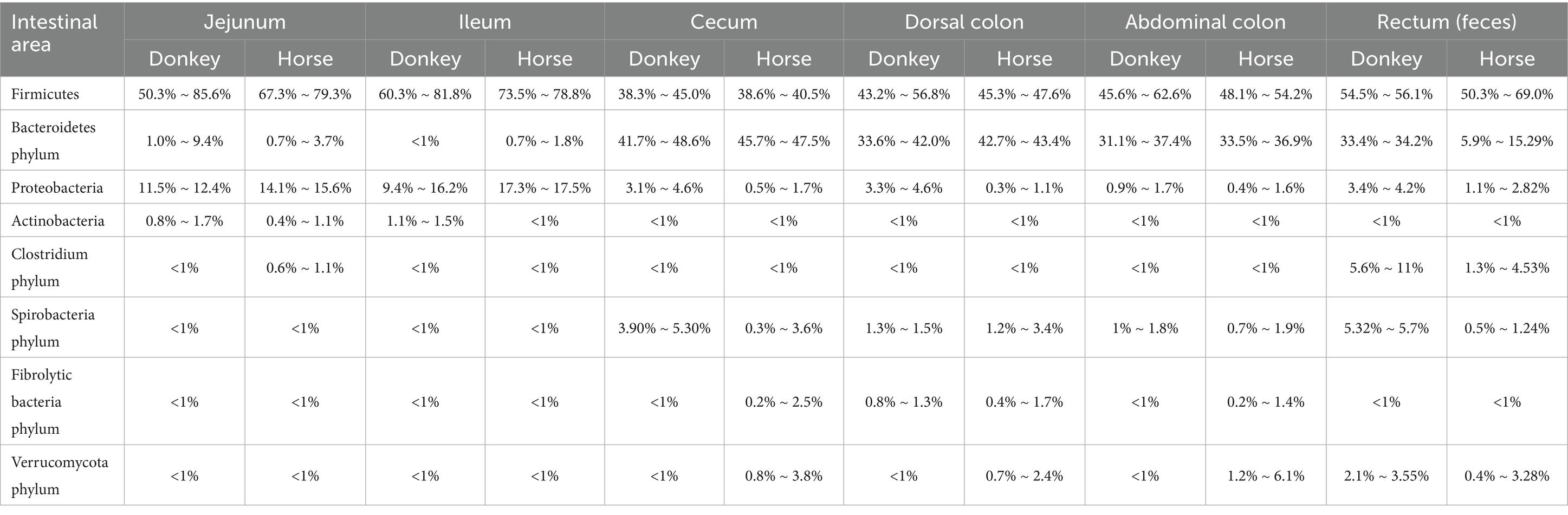 The core microbiota of the equine intestinal tract comprises microbial species that dominate the gut microbial community and significantly influence the health and physiology of equine animals. These microorganisms are characterized by their functional versatility and adaptability, enabling their persistent presence and vital role in the host’s digestive system. They contribute to nutrient metabolism, immune modulation, and the maintenance of intestinal homeostasis. However, the specific composition of the core microbiota is not uniform and may vary due to factors such as individual genetic differences, environmental conditions, and dietary practices (Costa and Weese, 2012). Understanding these variations is essential for developing tailored nutritional and management strategies to optimize the health and performance of equine animals. For ease of reference, the comparative abundance of gut microbiota in donkeys and horses has been presented in Table 1 and Figure 1, which are sourced from previously published articles (Liu, 2020; Su et al., 2020; Zhang et al., 2020; Liu et al., 2019).