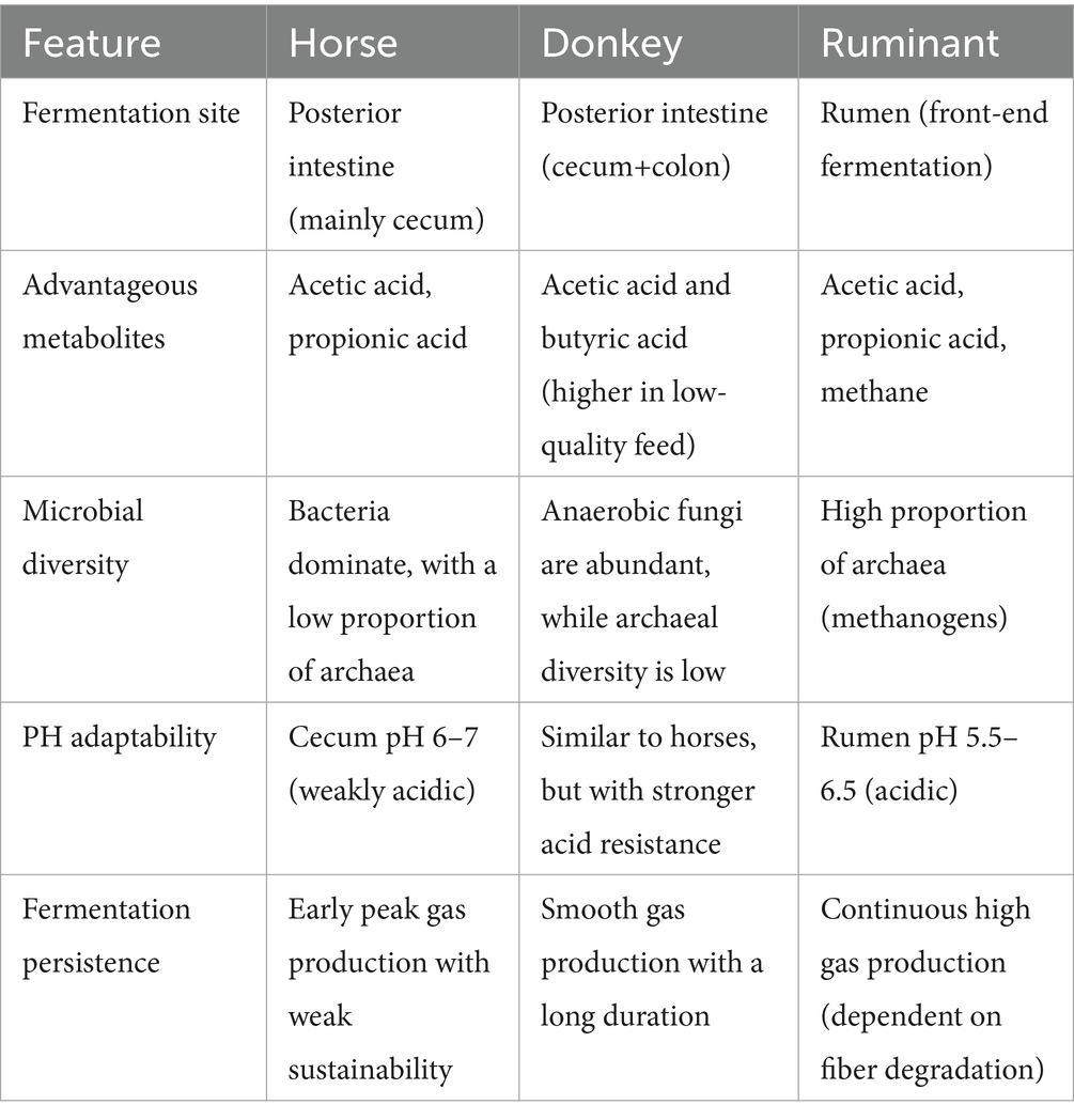 Further studies on different equine animals such as donkeys and horses have shown significant differences in the microbial composition of their gut microbiota. Liu (2020) reported that the ratio of Firmicutes to Bacteroidetes in donkeys is approximately 1:1, while in horses it is 0.8:1. The ratio of Firmicutes/Bacteroidetes has been shown to affect obesity in animals, with higher ratios promoting increased energy absorption and fat storage (Bell, 2015; Ley et al., 2003). Liu (2020) confirmed these findings, demonstrating that under the same feeding conditions, donkeys tend to accumulate more fat than horses. This difference may be due to the specific metabolic functions of these bacterial phyla: Bacteroidetes mainly metabolize steroids, bile acids, and polysaccharides, while Firmicutes focuses on fermenting carbohydrates. Interestingly, animal methane emissions may be partially influenced by diet, but are also related to genetic factors. Methanogenic bacteria are widely regarded as the most heritable gut microbiota in humans and various animal populations (Grieneisen et al., 2021), and are also representative archaea in the cecum of horses. In the intestine of horses, the fermentation site is mainly in the cecum (pH 6–7), with bacteria dominating (mainly Firmicutes and Bacteroidetes), a low proportion of archaea, and weak methane production pathways. The dominant metabolites are acetic acid and propionic acid, and the peak gas production during fermentation is early with weak persistence. In contrast, the intestine of donkeys is mainly fermented in the cecum and colon (Zhang et al., 2022d), with a large number of anaerobic fungi (such as Ruminococcus). The diversity of archaea is low, and the gas production during fermentation is gentle and long-lasting. It can effectively degrade cellulose, prolong the retention time of chyme, and improve fiber digestion rate. For ease of reference, Table 2 shows the differences in gut fermentation patterns and microbiota between horses and donkeys (supplemented with the fermentation patterns of ruminants as a reference). These data are sourced from previously published articles (Liu, 2020; Li et al., 2023; Beckers et al., 2017; McCann et al., 2017). Stothart et al. (2024) found in their study of Sable Island horses that microbiome characteristics closely related to survival have higher interannual reproducibility among individuals. This result may indicate that, like other mammals, microorganisms associated with intestinal methane production may have a partially accumulated genetic basis or be influenced by the preferential effect of Sebur Island horses.