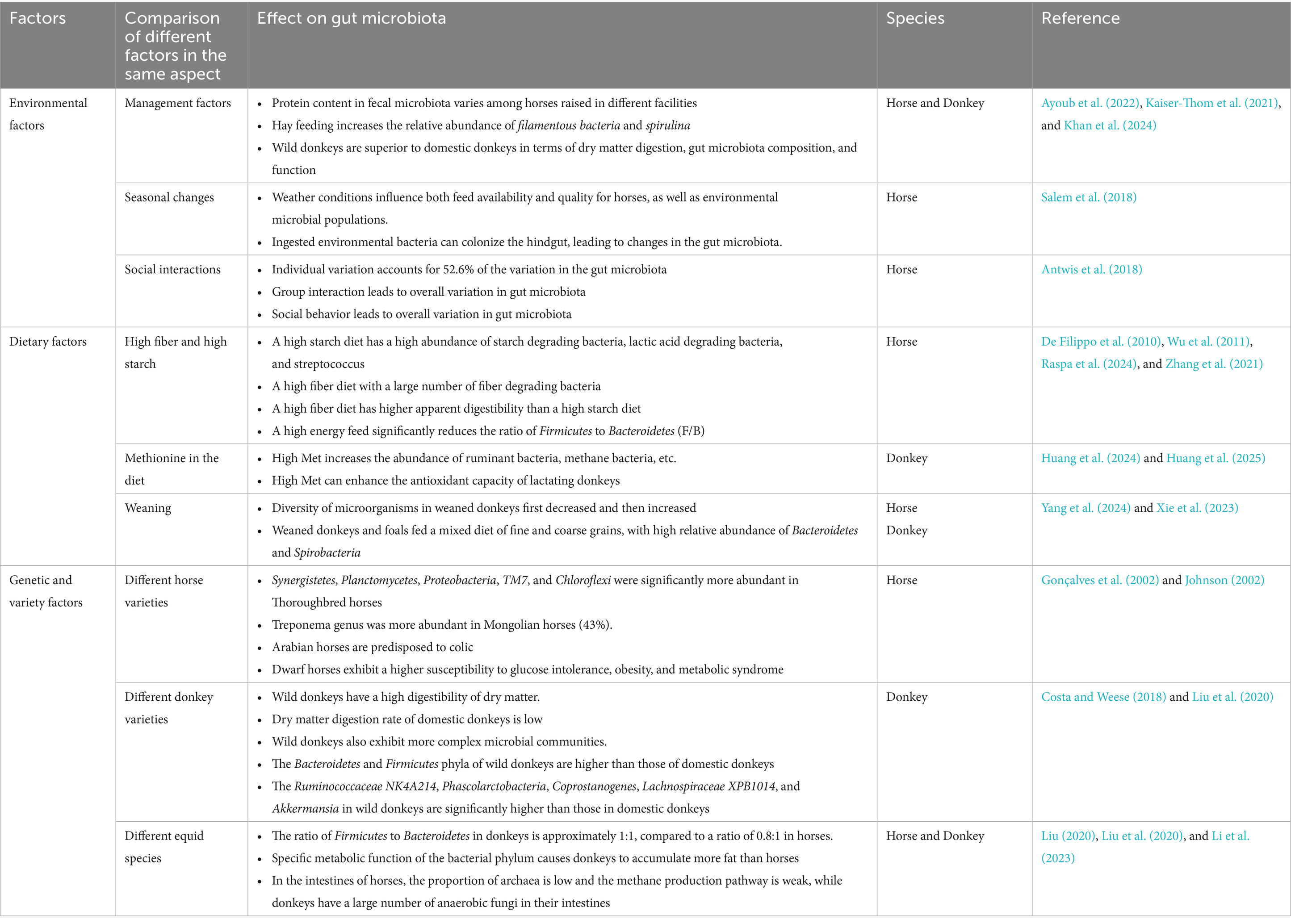 Additionally, it is important to consider the impact of factors such as the health status and management of equine animals on their gut microbiota composition and structure. The gut microbiota of different breeds of animals can also vary greatly in an unhealthy state, so individual and breed differences, as well as differences between age groups, can also make the process of defining the microbiota of “healthy” or “diseased” equines complex (Murcia, 2019). It is noteworthy that metagenomic studies alone cannot provide a complete understanding of the functional pathways of microbial communities (Marchesi and Ravel, 2015). Without complementary metabolomic analyses, it is difficult to establish causal relationships between changes in microbial composition and physiological outcomes in horses. Metabolomics, which provides direct insights into cellular activity by profiling metabolites in a given environment, holds significant potential for elucidating the functional significance of microbial communities and their impact on host physiology (Garber et al., 2020; Li et al., 2023). For ease of reference, Table 3 and Figure 1 show various comparisons of regulatory factors of the gut microbiota in equine animals, and list the references.