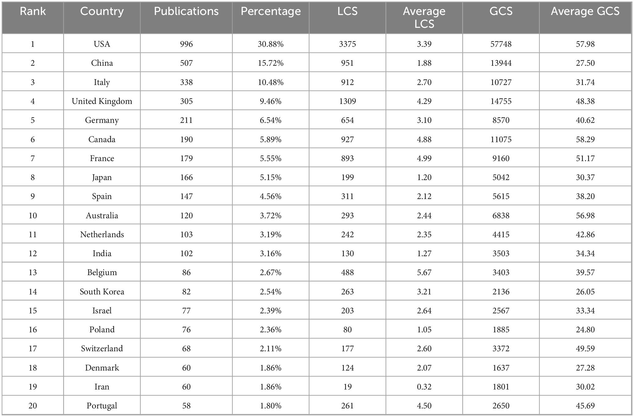 The USA and China emerged as the dominant contributors, collectively accounting for 46.6% of publications, reflecting their substantial investments and research infrastructure. The USA led in total output (996 publications, 30.88%) and maintained a high average GCS (57.98), indicative of strong scholarly influence. China ranked second in output (507, 15.72%) but had a lower average GCS (27.50), suggesting room for greater international impact. Other high-output countries included Italy, the UK, and Germany. Notably, Canada (avg. GCS 58.29) and Australia (56.98) achieved high per-paper citation rates despite moderate productivity, reflecting focused research excellence. Regional disparities were further evident in LCS. Belgium, France, and Canada led in average LCS, whereas several East Asian nations and emerging economies (e.g., China, South Korea, Iran) showed lower regional citation visibility. Collaboration networks were most intensive among North American and Western European countries, highlighting the role of established research ecosystems in fostering high-impact partnerships.