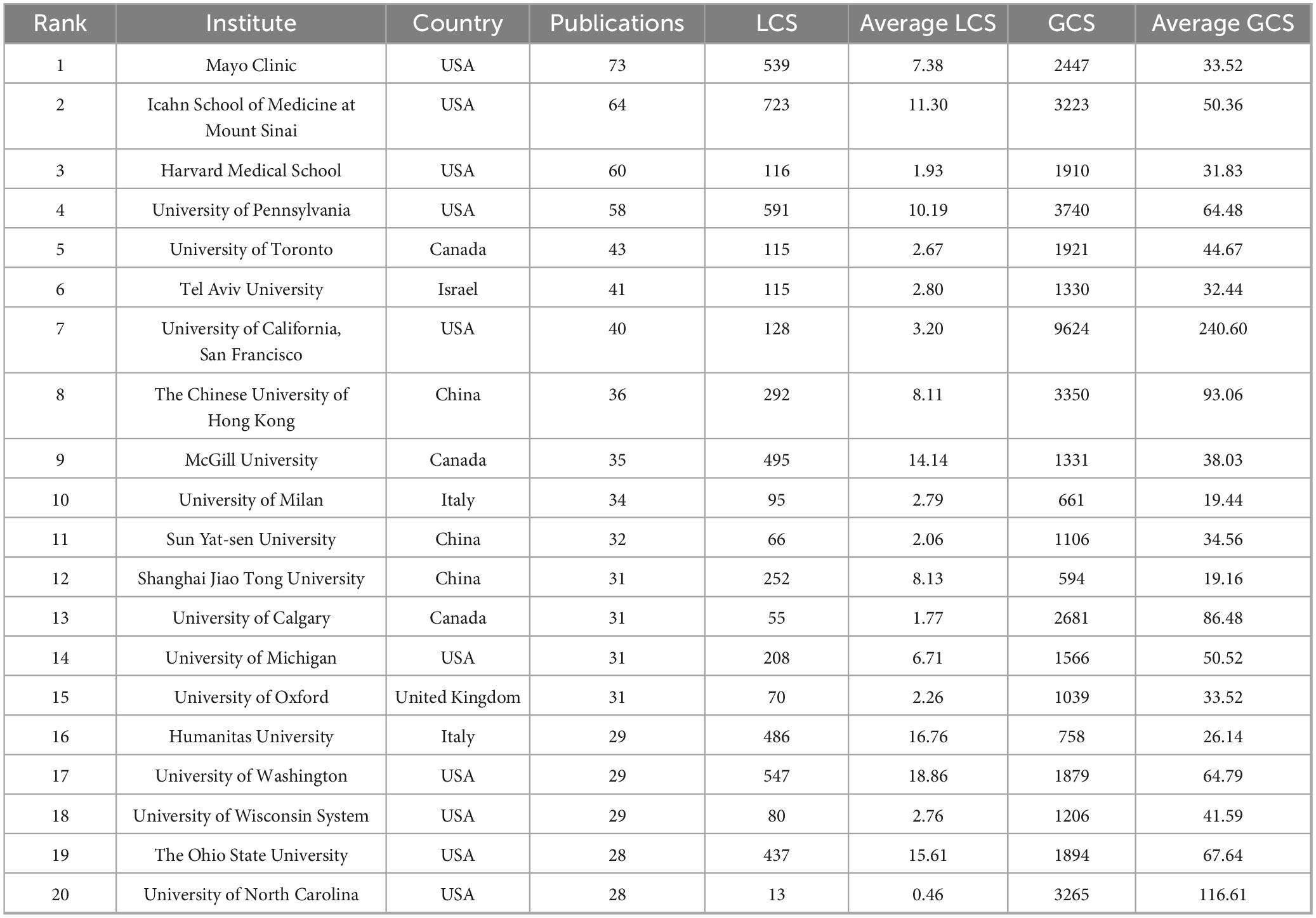 A total of 4,749 institutions contributed to this field. As listed in Table 2, the top 20 most productive institutions (each with ≥28 publications) were identified. Institutions from the USA predominated (13 out of 20), followed by China and Canada (3 each), Israel (1), Italy (2), and the UK (1).