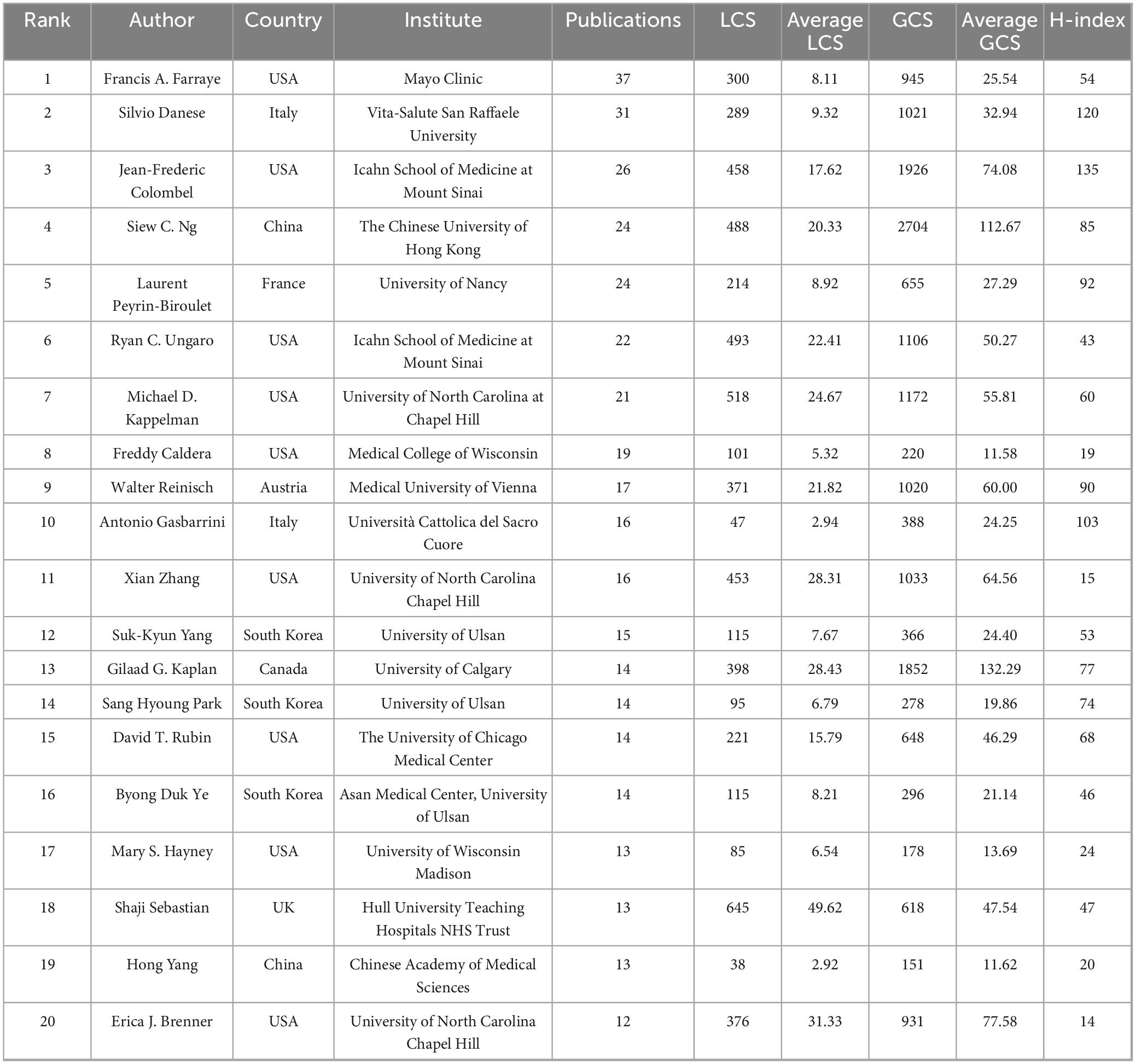 A total of 18,255 authors contributed to the 3,225 publications. Table 3 lists the top 20 most prolific authors (each with ≥12 publications). Francis A. Farraye (USA) led with 37 publications, followed by Silvio Danese (Italy) with 31, and Jean-Frederic Colombel (USA) with 26. In terms of total LCS, Shaji Sebastian (UK) ranked first with 645 points and also had the highest average LCS (49.62), followed by Michael D. Kappelman (USA, with a total LCS of 518 and an average LCS of 24.67) and Ryan C. Ungaro (USA, with a total LCS of 493 and an average LCS of 22.41). Regarding GCS, Siew C. Ng (China) took the lead with a total GCS of 2704, followed by Jean-Frederic Colombel (USA, with a total GCS of 1926 and an average GCS of 74.08) and Gilaad G. Kaplan (Canada, with a total GCS of 1852). For average GCS, Gilaad G. Kaplan topped the list with 132.29, followed by Siew C. Ng (112.67) and Erica J. Brenner (USA, 77.58) and Colombel (74.08). The H-index, a metric reflecting sustained scholarly influence, was highest for Jean-Frederic Colombel (135), followed by Silvio Danese (120) and Antonio Gasbarrini (103).