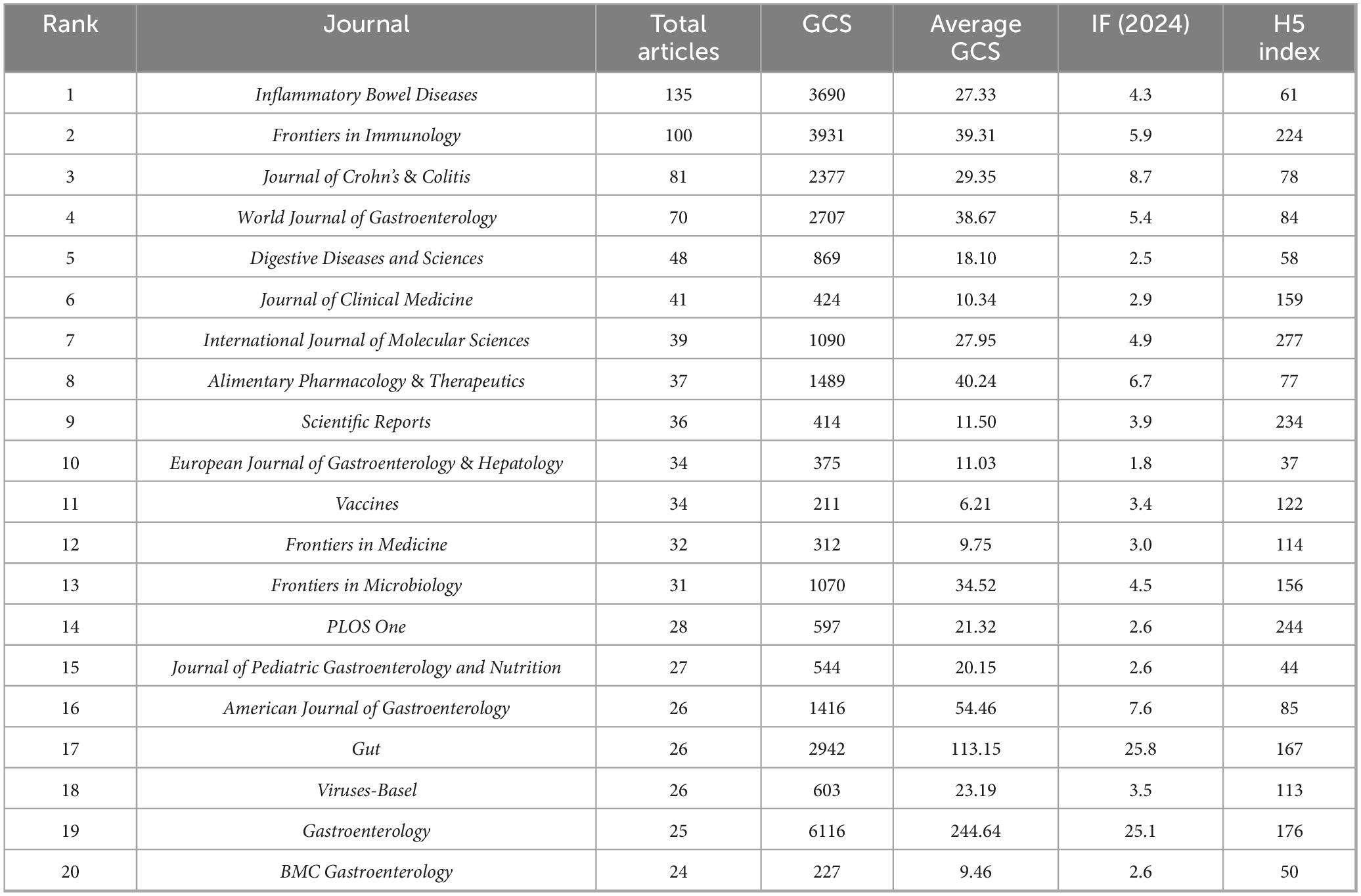 A total of 966 journals were represented in the virus-IBD research. Table 4 presents the top 20 journals by publication volume. Inflammatory Bowel Diseases led with 135 articles, followed by Frontiers in Immunology (100) and Journal of Crohn’s & Colitis (81). In terms of GCS, Gastroenterology received the highest total GCS (6,116), far exceeding other journals, and achieved the highest average GCS (244.64). Frontiers in Immunology ranked second in total GCS (3,931), while Gut recorded the second-highest average GCS (113.15). Regarding journal influence metrics, Gut and Gastroenterology led with the highest Impact Factors (25.8 and 25.1, respectively). Among the H5 index values, which reflect recent scholarly impact, International Journal of Molecular Sciences scored highest (277), followed by PLOS One (244) and Scientific Reports (234). These metrics collectively underscore the significant role of these journals in disseminating high-impact virus-IBD research.