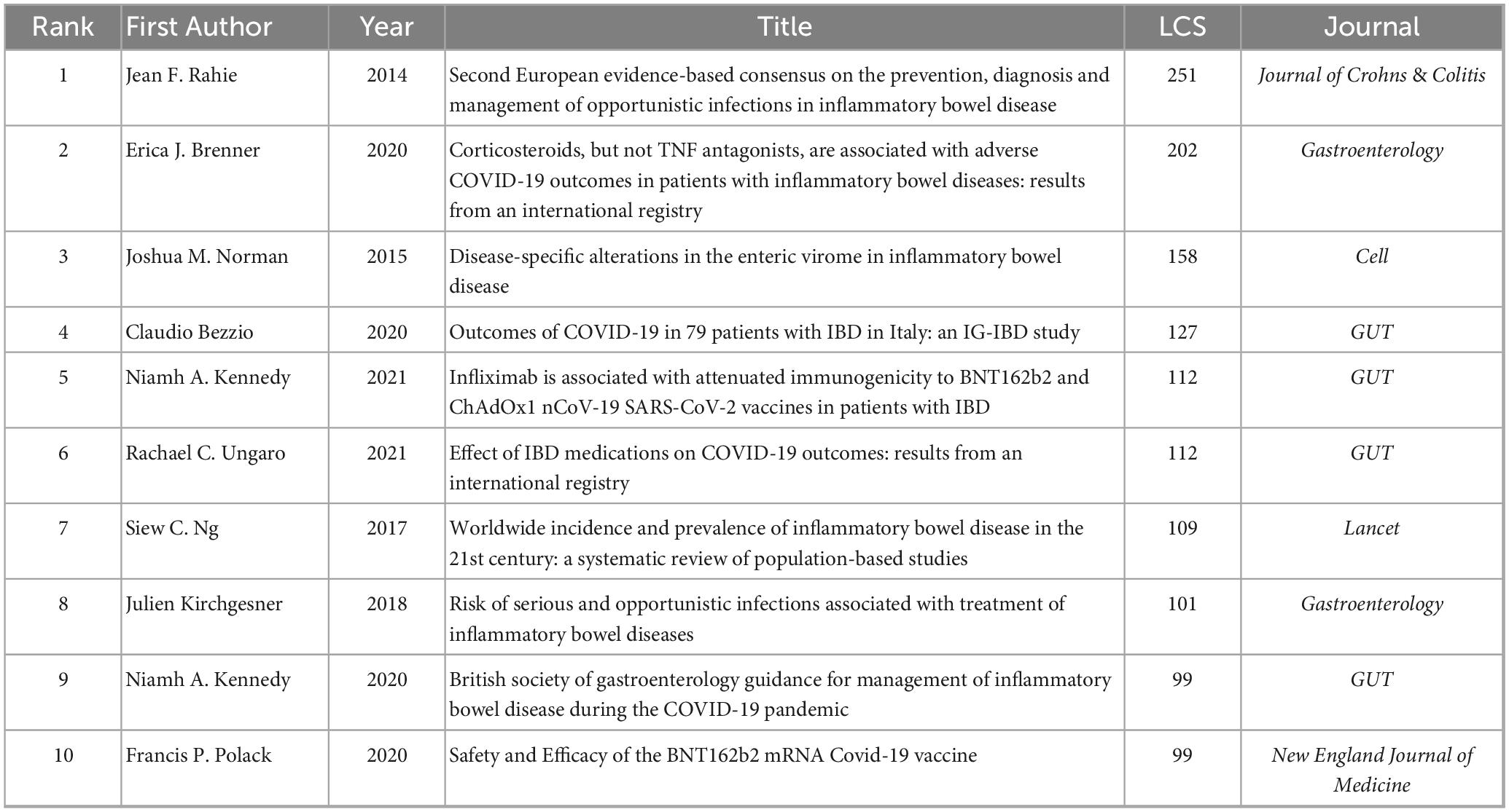 To pinpoint core foundational studies in virus-IBD research, we extracted the top 10 LCS using HistCite, detailed in Table 5. These publications reflect several prominent research themes: (1) Clinical management and guidelines for opportunistic infections and COVID-19 in patients with IBD (Rahier et al., 2014; Bezzio et al., 2020; Brenner et al., 2020; Kennedy et al., 2020; Ungaro et al., 2021); (2) Vaccine immunogenicity and outcomes in IBD (Polack et al., 2020; Kennedy et al., 2021); (3) Viral ecology in IBD, like enteric virome changes (Norman et al., 2015); (4) Epidemiology and infection risks associated with IBD treatments (Ng et al., 2017; Kirchgesner et al., 2018). The most cited reference was the second European consensus statement on opportunistic infections in IBD (LCS = 251) (Rahier et al., 2014), followed by a study on COVID-19 outcomes under corticosteroid therapy (LCS = 202) (Brenner et al., 2020), and a study on enteric virome changes (LCS = 158) (Norman et al., 2015). Notably, five of the top ten publications focused on COVID-19, highlighting its significant impact on recent IBD research.