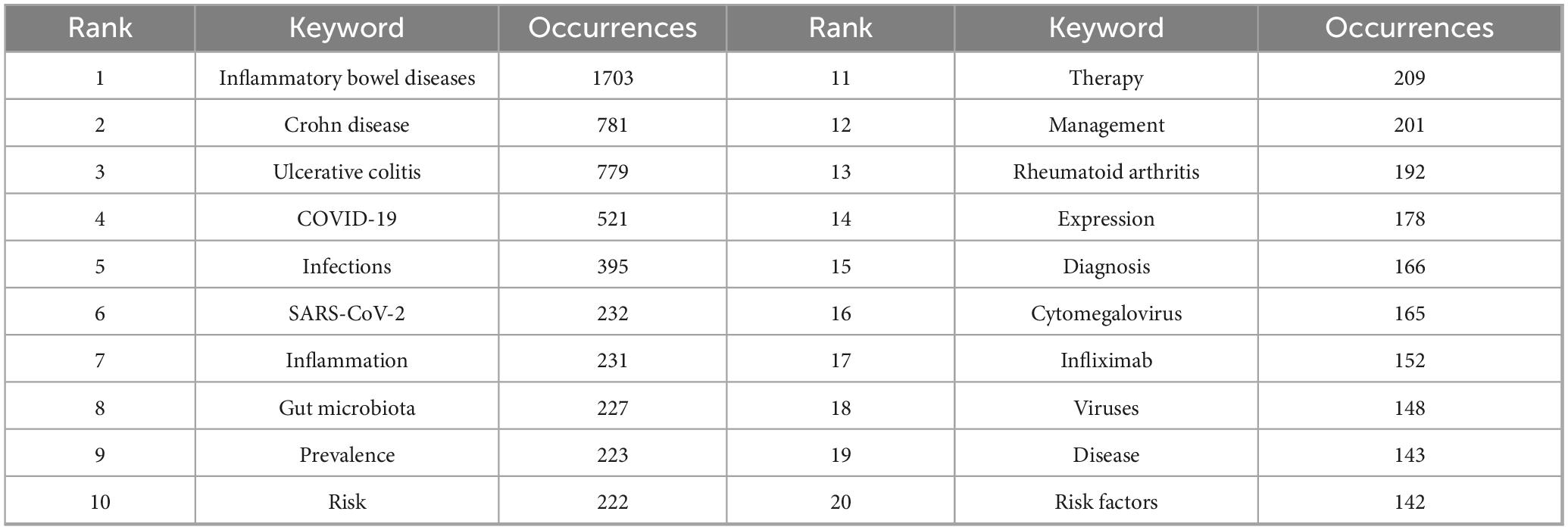 This analysis included all retrieved literature relevant to viruses and IBD without preemptively excluding any virus type. Studies related to SARS-CoV-2 were retained even when IBD was not the central focus, as they represent a substantive thematic trend and contribute to the overall knowledge structure of the field, thereby aligning with the objective nature of bibliometric analysis.