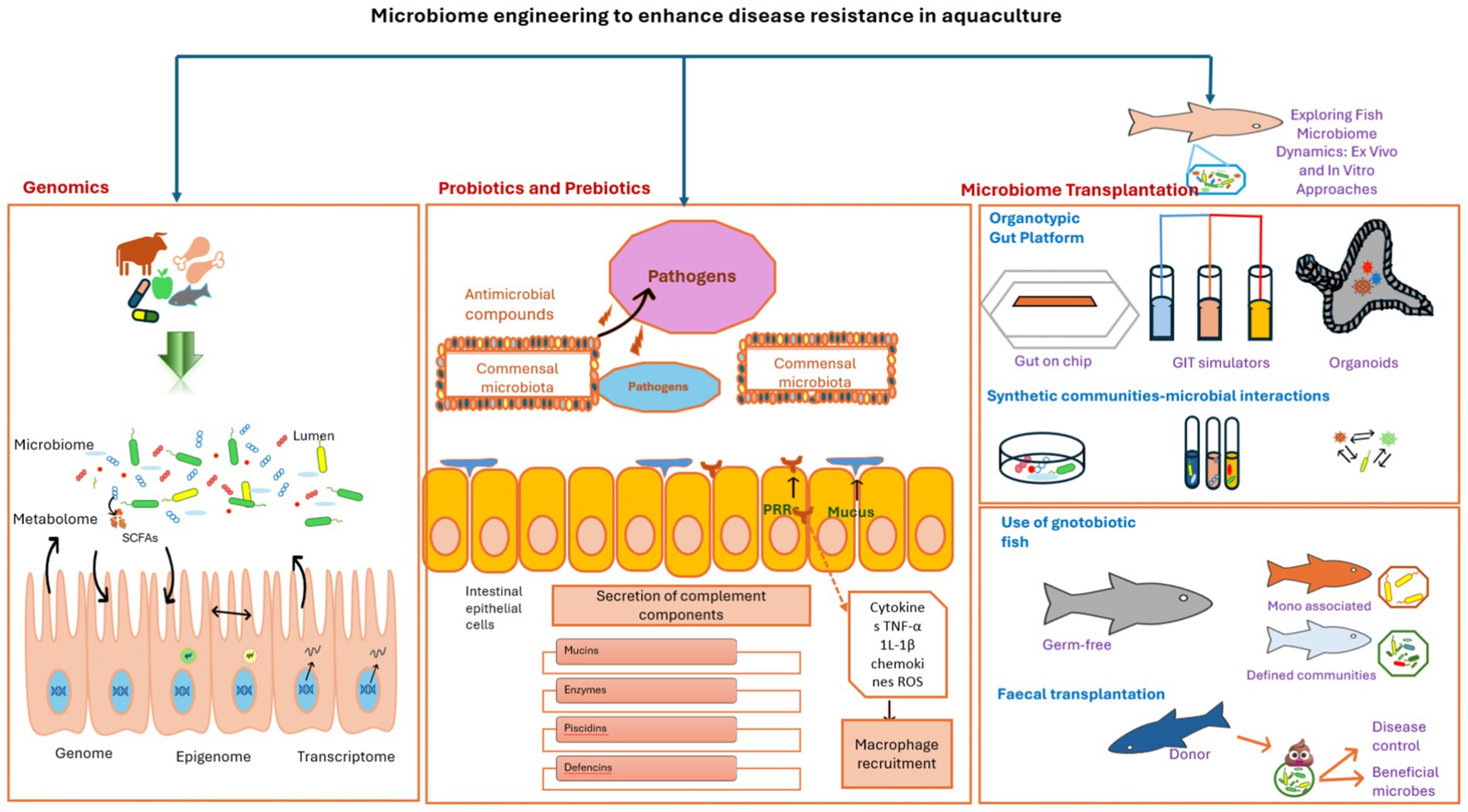 Keywords: aquaculture microbiome, climate resilience, CRISPR engineering, disease resistance, fecal microbiota transplantation (FMT), multi-omics, probiotics, sustainable aquaculture