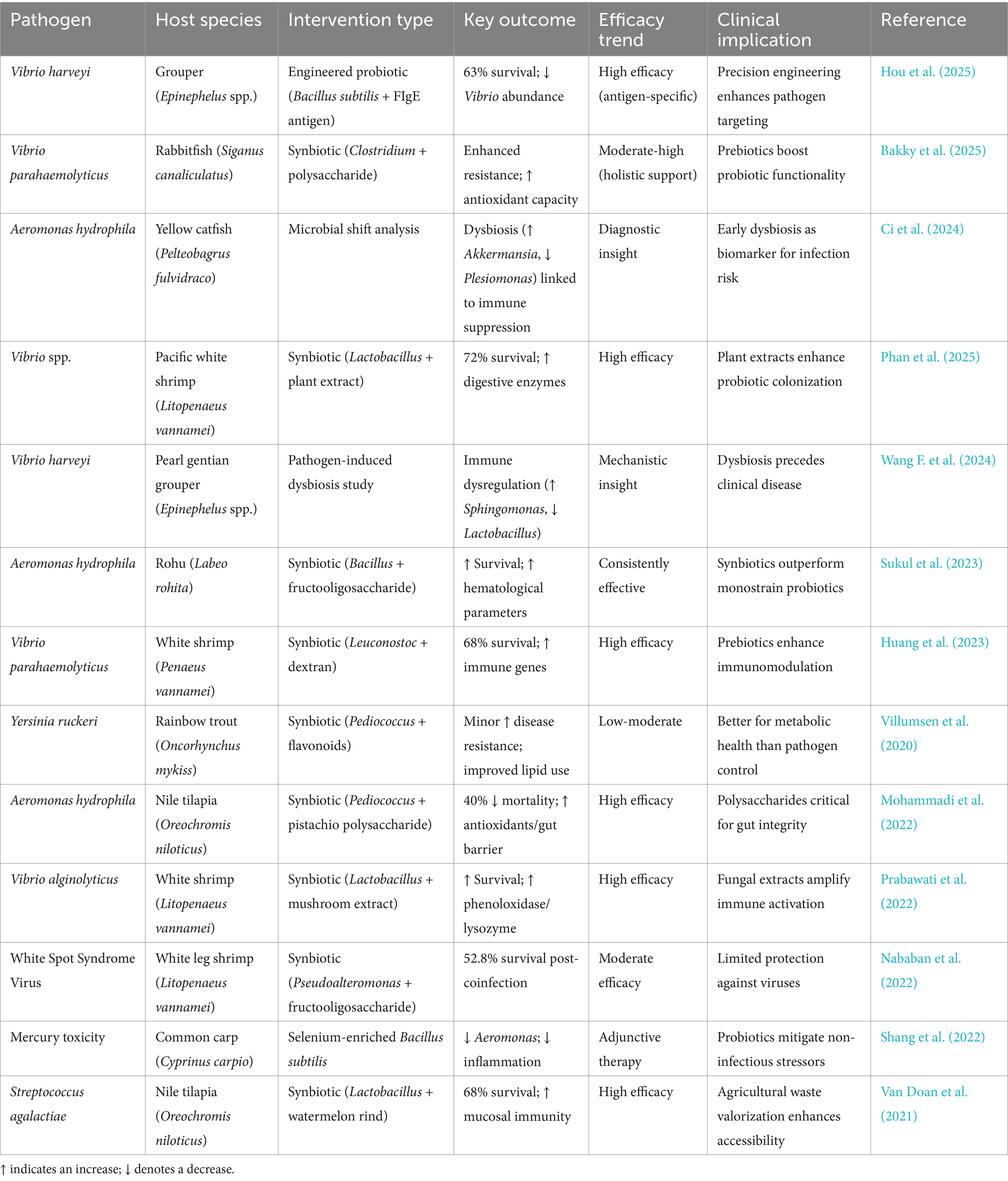 Global aquaculture reached a historic milestone in 2022 by producing 94.4 million tonnes of aquatic animals, representing 51% of total production, and 130.9 million tonnes when including algae (FAO, 2024). This achievement highlights aquaculture’s crucial role in global food security, yet rapid expansion has intensified sustainability challenges such as disease outbreaks and antimicrobial resistance (AMR). Asia, responsible for 70% of aquatic animal production, faces severe disease-driven losses (Sampson, 2024). Despite vaccine development, pathogens like Vibrio parahaemolyticus (causing acute hepatopancreatic necrosis disease, AHPND) and Streptococcus agalactiae (causing streptococcosis) continue to cause global annual losses exceeding one billion dollars due to strain- and host-specific pathogenicity, inadequate infrastructure, and limited vaccine coverage in small-scale farms (Yen et al., 2021; Wang T. et al., 2024). These impacts are worsened in low- and middle-income countries (LMICs) by inadequate infrastructure and limited access to sustainable alternatives. The limitations of antibiotics and inconsistent probiotics spurred interest in holistic ‘microbial community management’ (Bossier et al., 2016), recognizing hosts as holobionts dependent on balanced microbiota. For example, a survey of 231 small-scale carp polyculture farms in Bangladesh revealed 46.8% report outbreaks of epizootic ulcerative syndrome (EUS) and columnaris, with an average mortality of 10.23% (Debnath et al., 2024). Similarly, a study of Lao PDR farms found 57.5% of fish farms rely on antibiotics against streptococcosis, with specialized operations exhibiting the highest antimicrobial dependence (Poupaud et al., 2022). Other threats include Edwardsiella tarda in Japanese eel and Aeromonas hydrophila in hybrid catfish, both causing 30–50% reductions in yield in intensive systems (Huang J. et al., 2024; Lin et al., 2024).