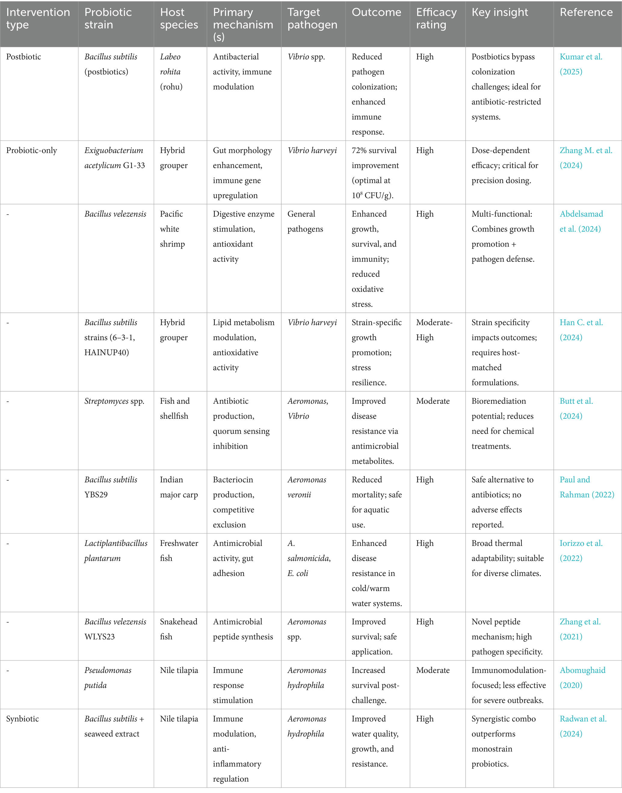 A key premise in probiotic development is that strain-specific traits (e.g., spore formation, bacteriocin production) must align with host physiology and environmental conditions for efficacy. Probiotics exert their protective effects in aquaculture through multifaceted mechanisms, including the production of antimicrobial compounds (e.g., bacteriocins, organic acids, enzymes), competitive exclusion of pathogens, and immunomodulation (Figure 1; Table 1). These mechanisms are harnessed in microbiome engineering to design targeted interventions, though their efficacy depends critically on strain selection, host compatibility, and environmental stability. For instance, Bacillus subtilis subsp. inaquosorum BSXE-2102 synthesizes 12 secondary metabolites with potent antagonistic activity against aquatic pathogens (Qin et al., 2025), while Lactobacillus plantarum strains from kefir produce bacteriocins that suppress Vibrio alginolyticus (Tseng et al., 2023). Strain-specific efficacy is evident in Bacillus velezensis FiA2, which produces broad-spectrum oxydifficidin (Khan et al., 2025), and Streptomyces sp. D-6, which delivers novel bioactive metabolites (Zhao et al., 2025). Meta-analyses confirm Bacillus spp. outperform Lactobacillus in pathogen inhibition due to spore-forming resilience, whereas Streptomyces strains show unique bioremediation potential (Giri et al., 2024; Hoseinifar et al., 2024). However, limitations persist: survivability under gastrointestinal stress varies (31–75% acid tolerance at pH 2–4), adhesion capacity to the GI tract (a critical determinant of colonization success) is often strain-specific, efficacy is host-dependent, and inconsistent trial results occur across environments or host genotypes. For example, Bacillus subtilis NTU-18 improves growth in Anguilla japonica glass eels but requires precise dosing for other species (Lin et al., 2024). These constraints highlight the need for engineered solutions, such as encapsulation or host-adapted consortia, to improve reliability.