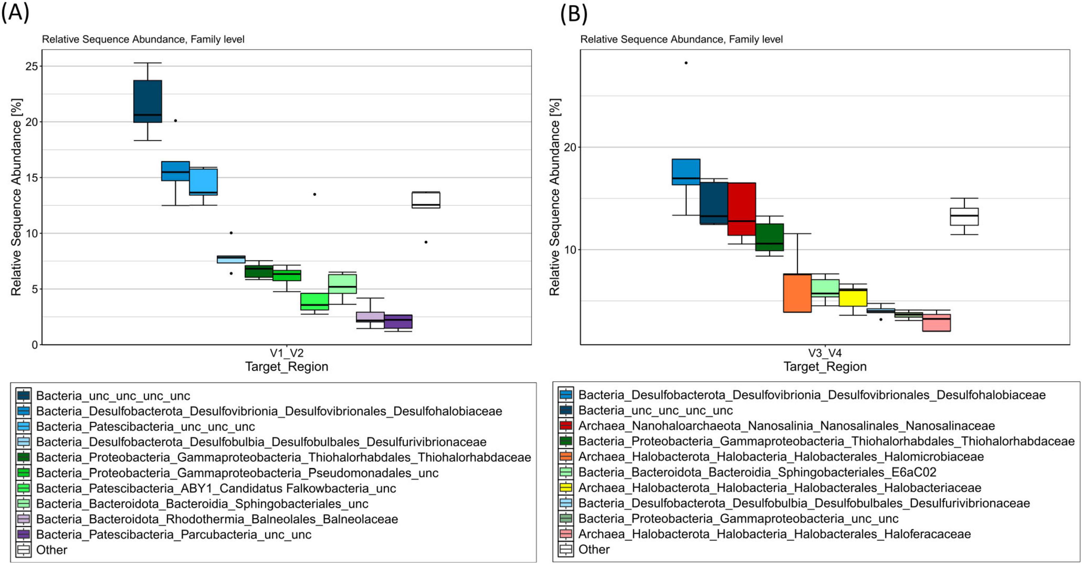 Figure 1. V1/V2 (A) and V3/V4 (B) 16S rRNA amplicon profiles from environmental DNA extracted from filtered brine water sampled at the Lunenburg brine (Germany). Taxa bar plots show the top 10 most abundant ASVs at the family level by relative sequence abundance (%). n = 5 samples (15 L each; 75 L total). Cool colors denote bacteria, warm colors denote archaea.