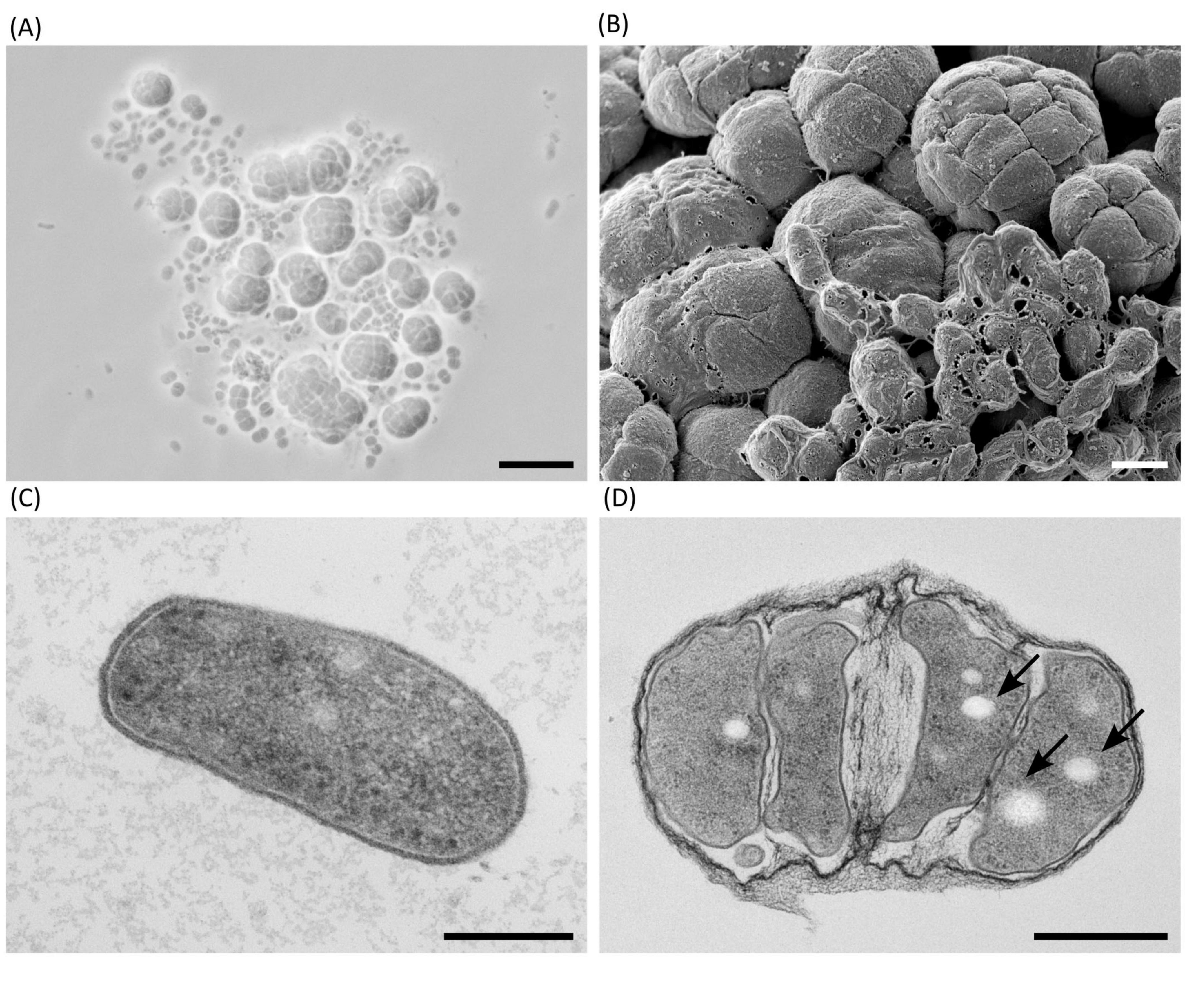 Figure 2. Microscopic morphology of Haloarcula sp. NS06 in light (A), scanning electron (B) and thin section electron microscopy (C,D). (A) In a 2-days-old artificial sea water (ASW) suspension culture, single cells are pleomorphic in shape, from round to rod-like, and frequently found in short chains or small aggregates. In addition to single cells and smaller groups, larger aggregates of larger cells are visible, which we have termed “package-like aggregates.” (B) Larger assemblies of package-like aggregates and short chains of single cells on top of them are visible, if cells are cultivated on agar for 3 weeks. (C) Transmission electron microscopy of a thin section through a single rod-shaped cell of a 23-days-old suspension culture shows a dense cytoplasm containing a few circular regions of lower density and some denser structures, which most likely represent ribosomes. The cell is limited by a thin and dense layer, which is separated from the plasma by a bright appearing gap most probably representing the central part of the plasma membrane. (D) Transmission electron microscopy of a thin section of a 23-days-old suspension culture through a larger group of cells which are enclosed by fibrous sheath. The bright-appearing inclusions (arrows) are visible in most section profiles. Panel (B) shows a composite micrograph generated by merging two images acquired at different focal planes. Scale bars represent 10 μm (A), 1 μm (B), 0.2 μm (C) and 0.5 μm (D).