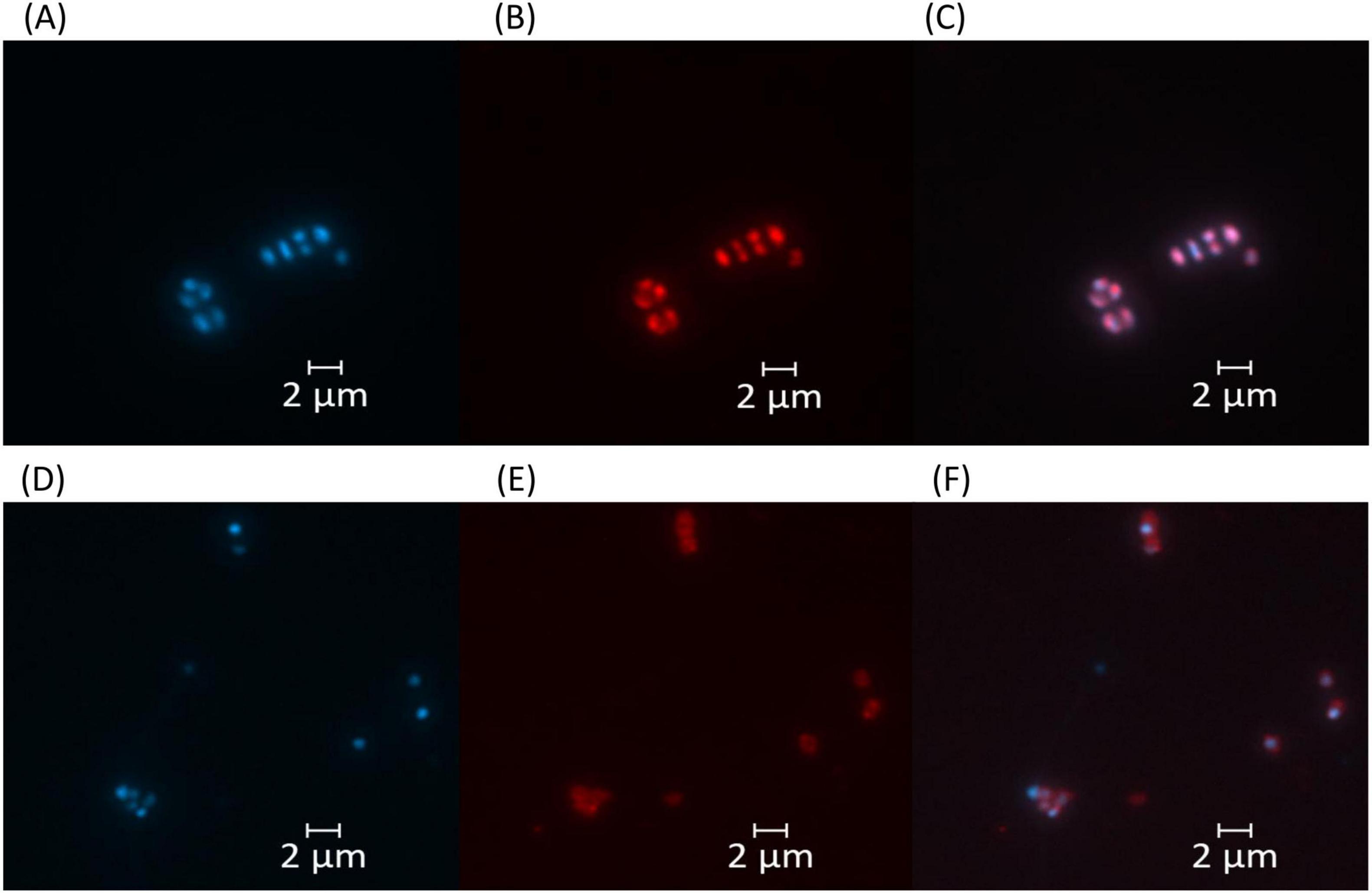 Figure 3. Fluorescence microscopy images of Haloarcula sp. NS06 (A–C) and Halorubrum sp. AS12 (D–F). Left panels (A,D) show DAPI fluorescence channel for DNA visualization, middle panels (B,E) display Nile Red fluorescence channel for whole cell stain, and right panels (C,F) represent the merged images of both channels. Cell inclusions appeared red within fluorescence microscopy after staining with the lipophilic dye Nile Red (B,E), although staining intensity was higher in Haloarcula sp. NS06 (B) than in Halorubrum sp. AS12 (E). Scale bars represent 2 μm.