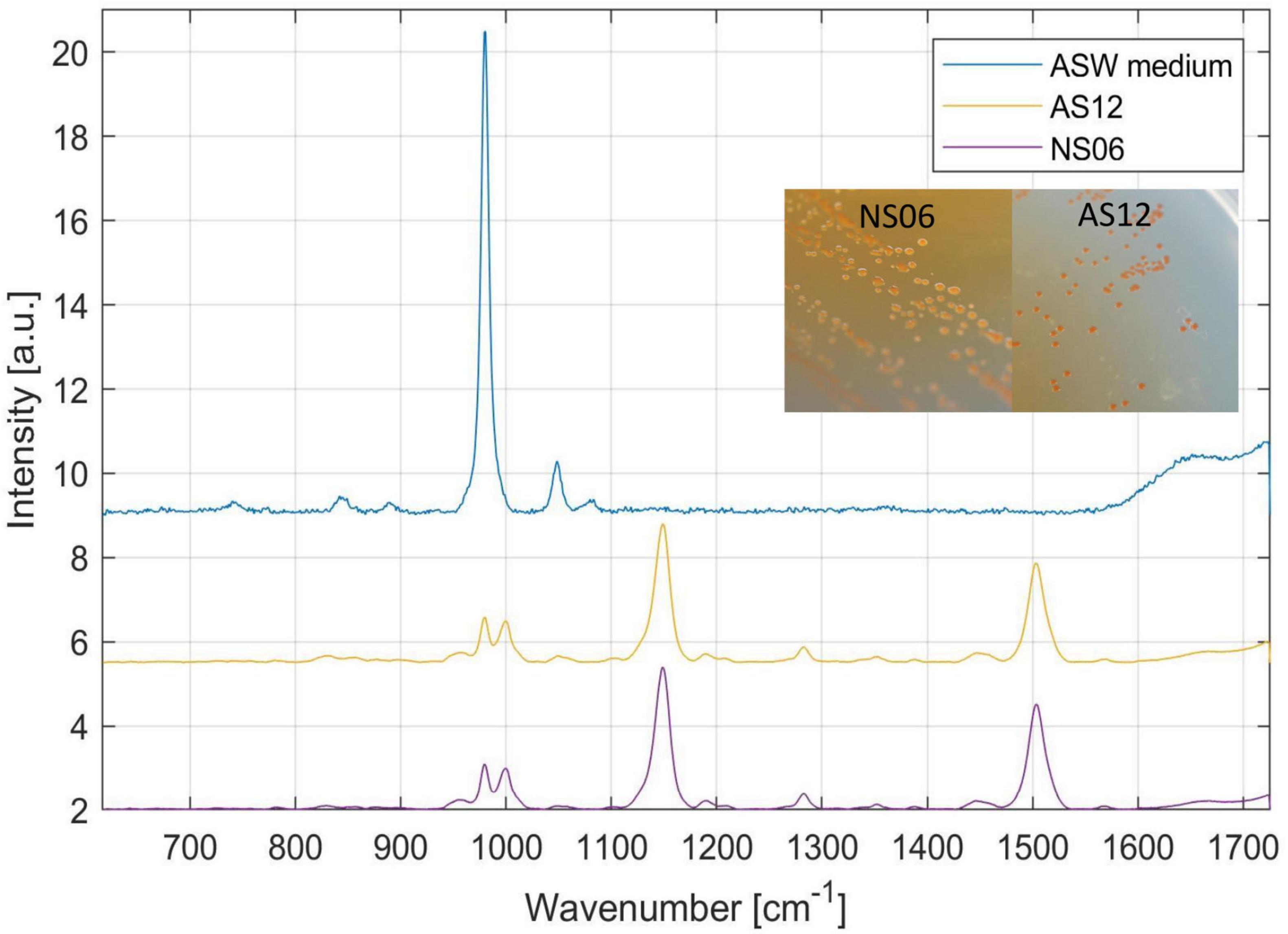 Figure 4. Raman spectroscopy and colony formation on artificial sea water (ASW) media of the two isolates Haloarcula sp. NS06 and Halorubrum sp. AS12 as well as the media as a reference. Raman spectra revealed main peaks for NS06 and AS12 at 980–1,000 (double peak), 1,147 and 1,504 cm−1, typical for carotenoids. In addition, minor peaks were recognized at 781, 828, 956, 1,048, 1,191, 1,282, 1,353, 1,389, 1,448, 1,567, and 1,664 cm–1. The first peak can be assigned to the internal background signal from the ASW media itself, since the media is showing a similar peak at 980 cm−1.